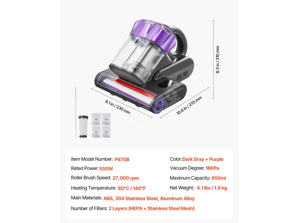 Ručný vysávač matracov 550W, 18Kpa, dvojitá nádoba, hepa, vyhrievanie