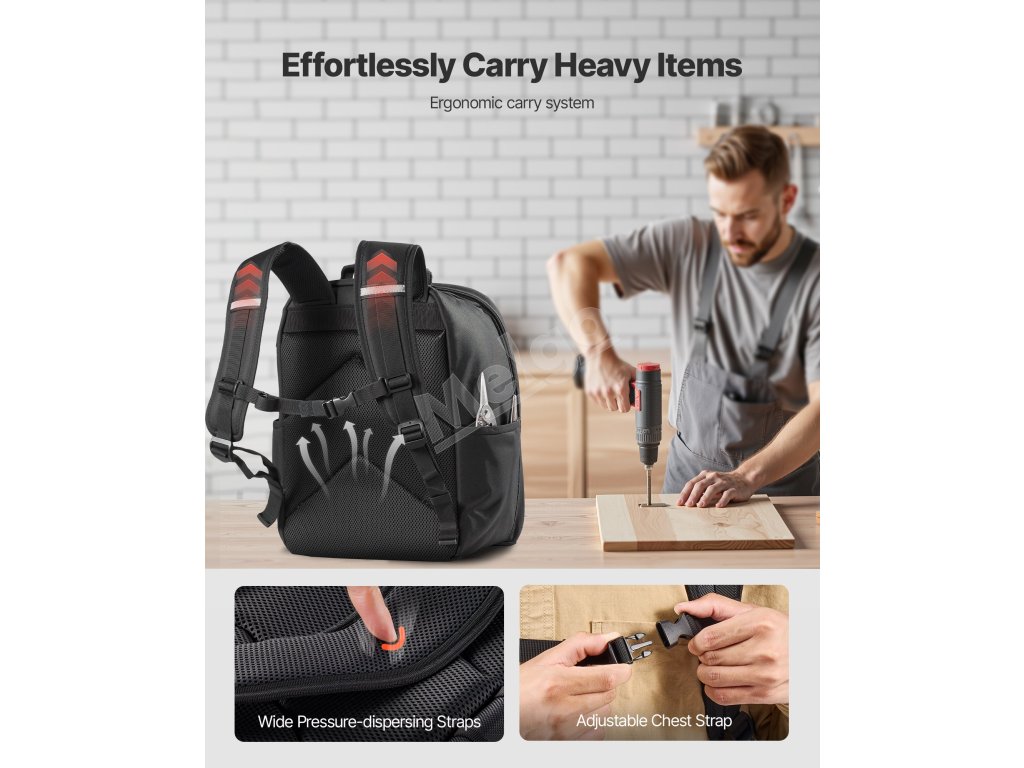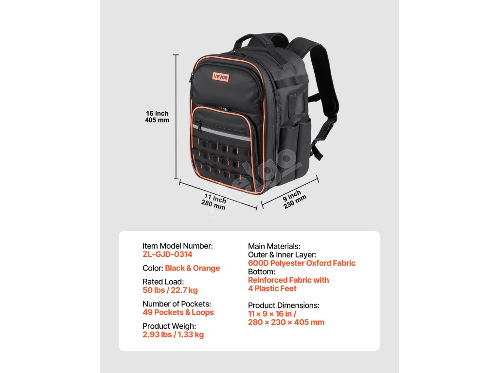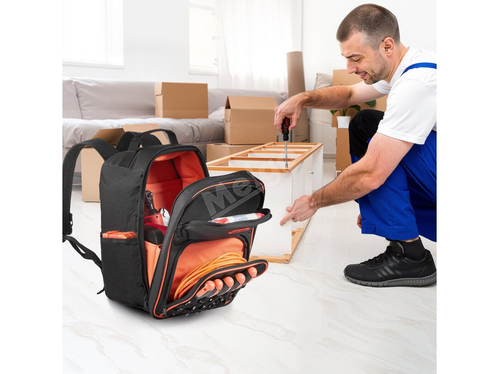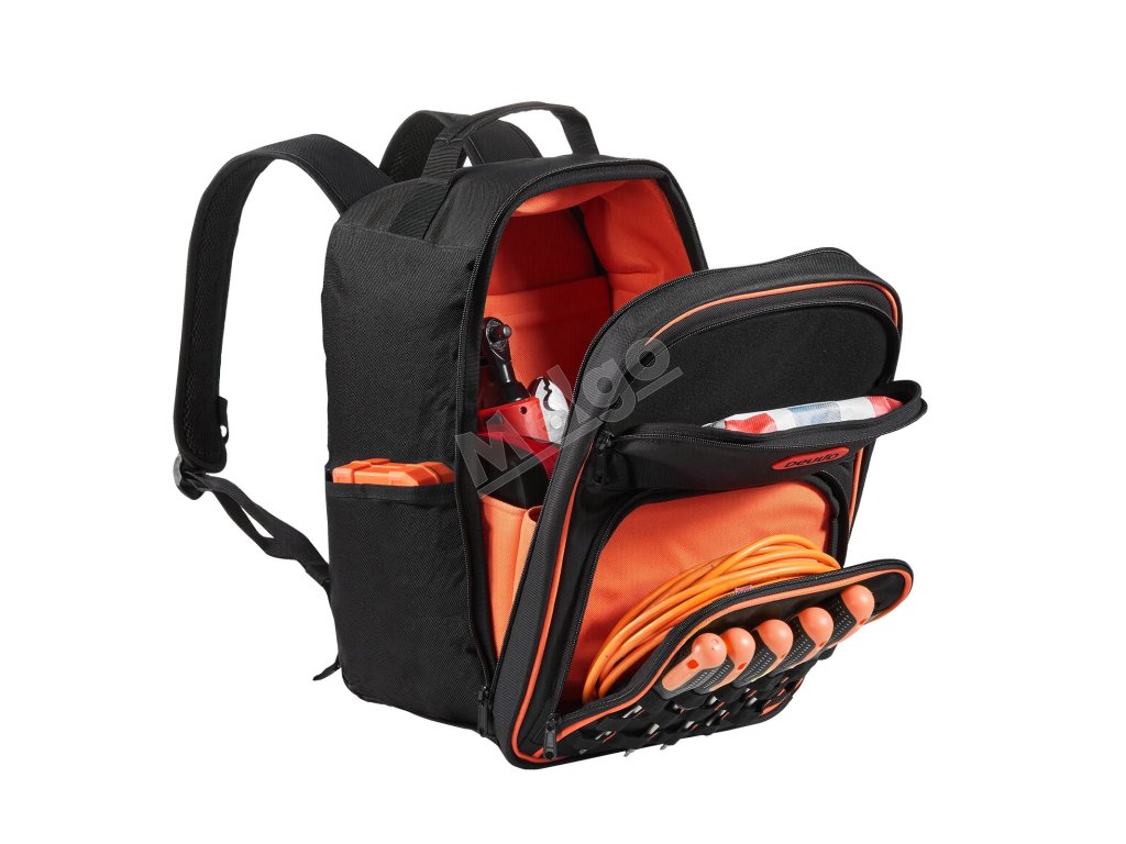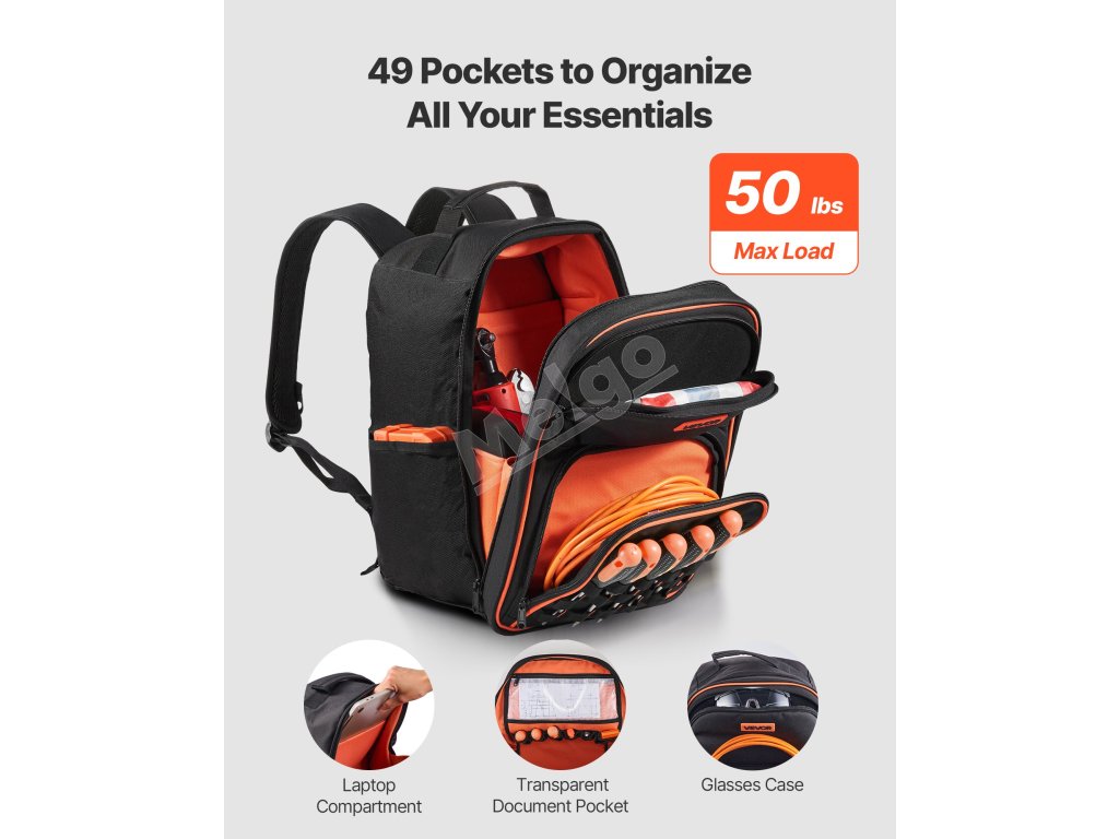 Tento batoh so 49 vreckami a pútkami pomáha organizovať náradie všetkých veľkostí. Obsahuje dokonca aj priehradku na notebook a priehľadné vrecko na zabezpečenie vašich cenností, čo z neho robí dokonalý nosič náradia!