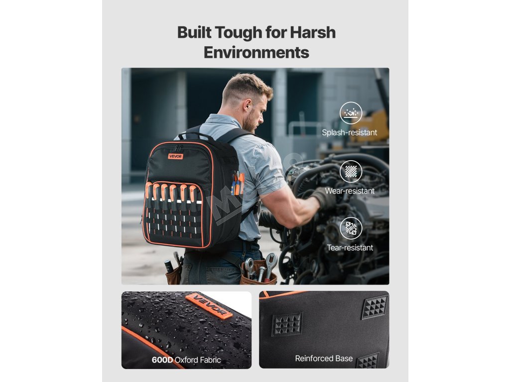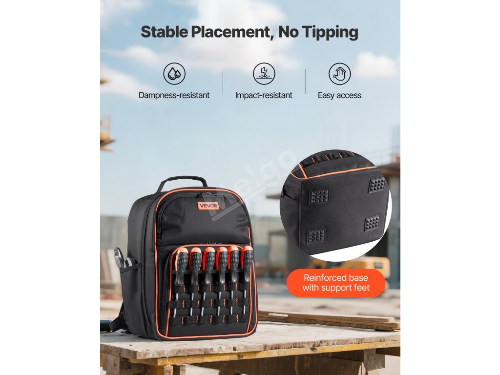 Tento batoh pre elektrikárov na stavenisko, vyrobený z odolnej tkaniny 600D Oxford, je odolný voči roztrhnutiu a opotrebovaniu. Dvojhlavý zips bol testovaný viac ako 20 000-krát a zosilnená základňa so 4 opornými nožičkami zaisťuje stabilitu, takže sa batoh neprevráti.