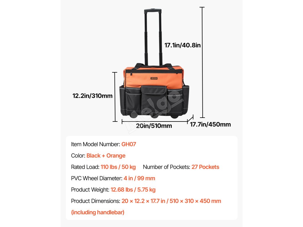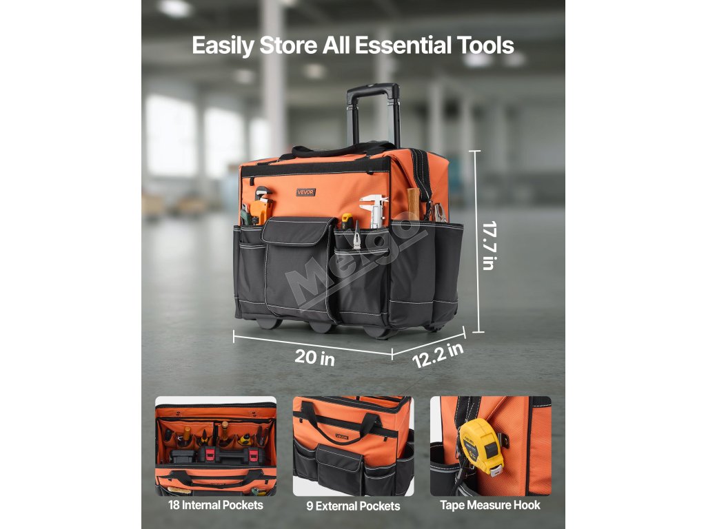 Vďaka 27 vreckám (18 vnútorným, 9 vonkajším) a háčiku na merací meter sa do tejto tašky na kolieskach na náradie na kolieskach zmestí všetko! Vďaka 40,8-palcovej nastaviteľnej rukoväti a 4-palcovým kolieskam sa ľahko pohybuje po akomkoľvek povrchu, čo zvyšuje efektivitu.