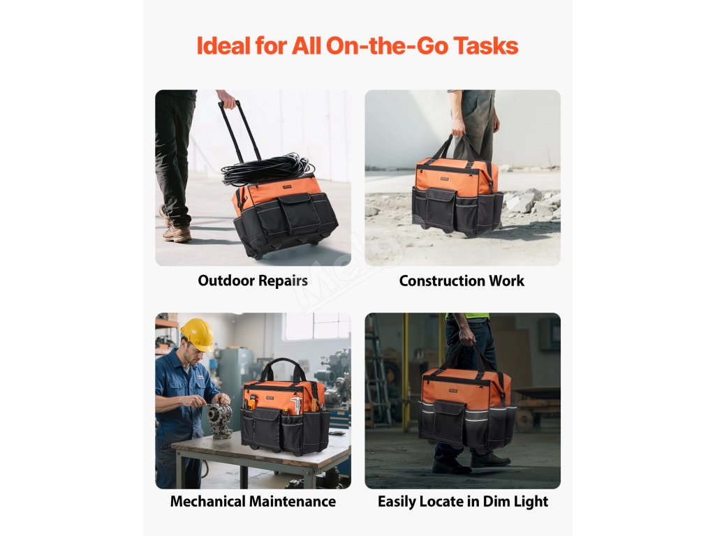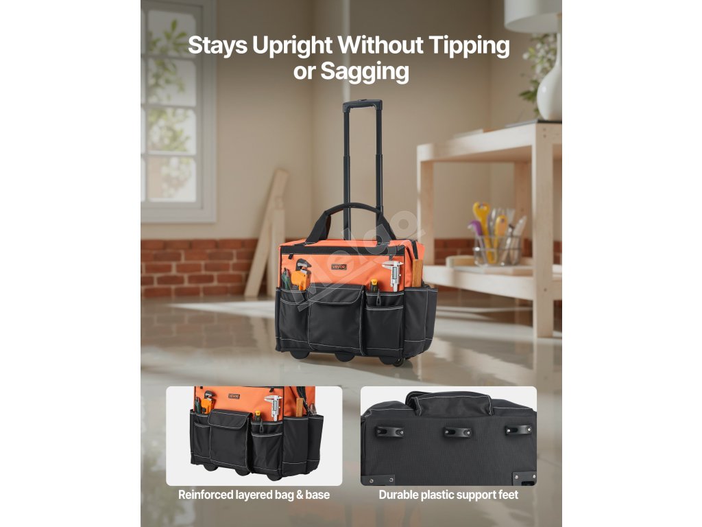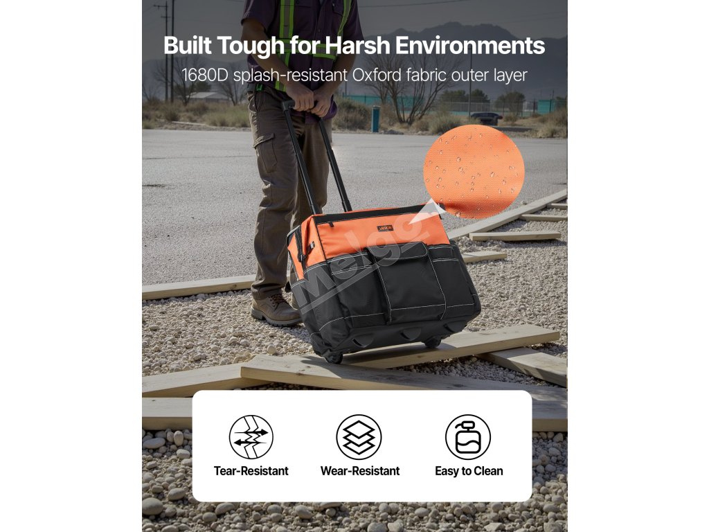 Táto ťažká taška na náradie na kolieskach je vyrobená z tkaniny 1680D Oxford, je pevná a odolná proti roztrhnutiu. Vystužené dno a oporné nožičky zabraňujú prevráteniu, udržiavajú náradie v bezpečí a uľahčujú prístup.