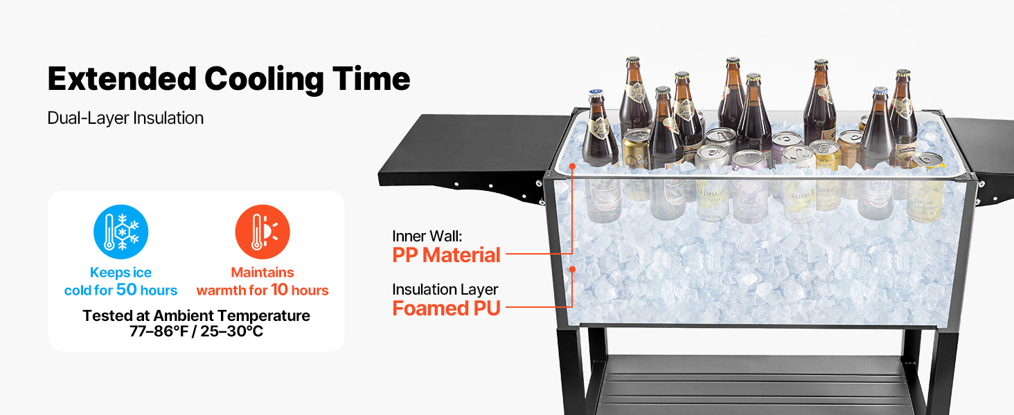 Náš pojazdný chladiaci vozík na ľad je vyrobený s vnútornou vložkou z PP a vysokoúčinnou izoláciou z PU peny, ktorá uzatvára studený vzduch. Udrží nápoje chladné až 50 hodín a teplé 10 hodín, vďaka čomu si môžete vychutnať ľadové nápoje aj počas horúcich letných dní.