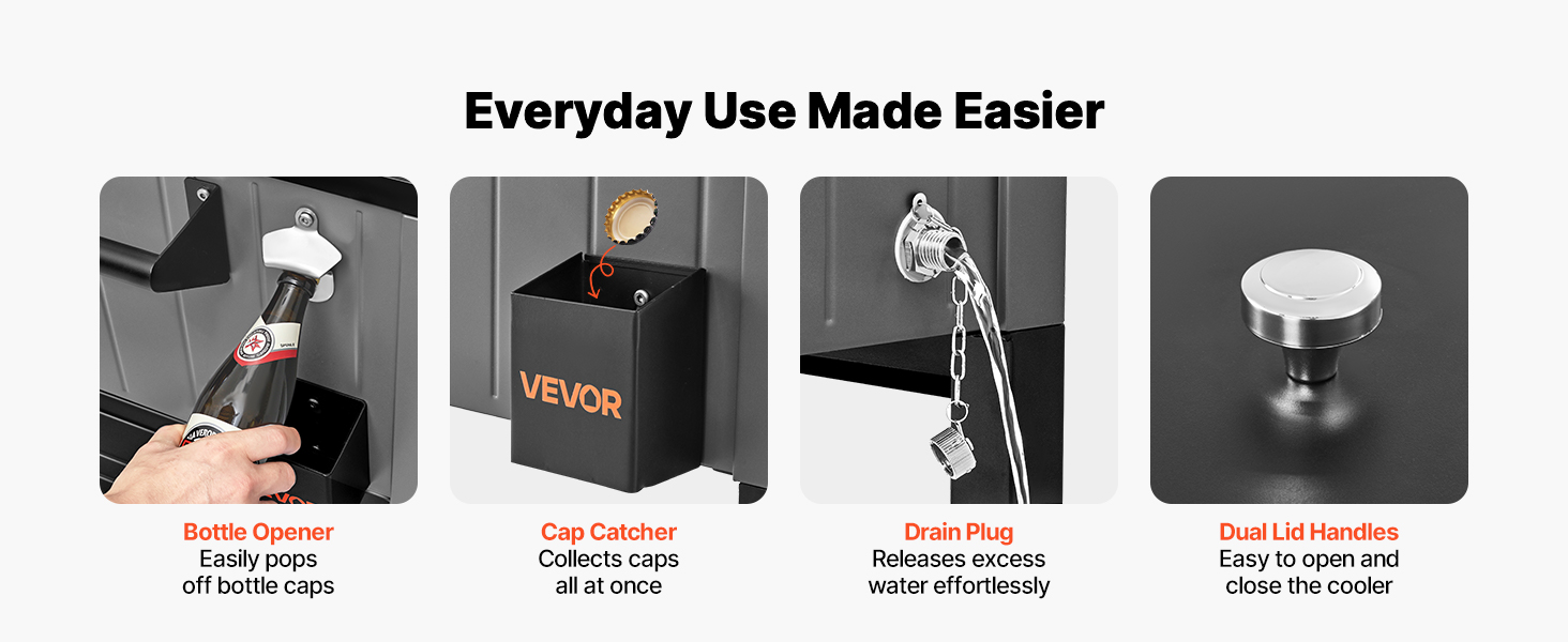 Vozík je vybavený zabudovaným otváračom na fľaše a zberačom uzáverov na udržiavanie poriadku v uzáveroch, vypúšťacou zátkou na rýchle vypúšťanie vody a dvojitými úchytmi veka na hladké otváranie a zatváranie, vďaka čomu je každodenné používanie pohodlnejšie.