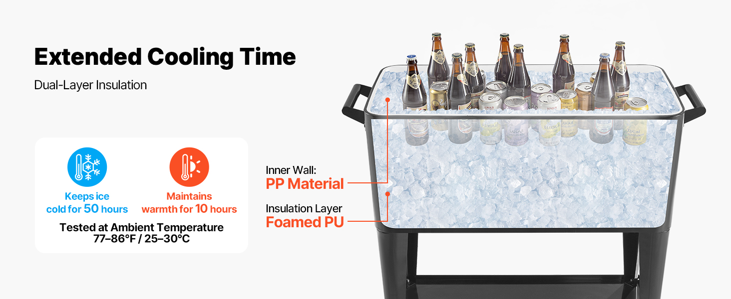 Náš pojazdný chladiaci vozík na ľad je vyrobený s vnútornou vložkou z PP a vysokoúčinnou izoláciou z PU peny, ktorá uzatvára studený vzduch. Udrží nápoje chladné až 50 hodín a teplé 10 hodín, vďaka čomu si môžete vychutnať ľadové nápoje aj počas horúcich letných dní.