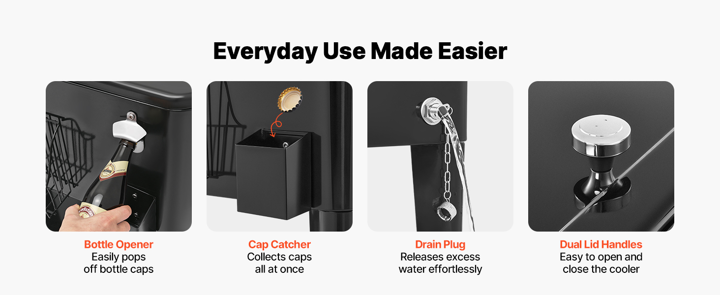 Vozík je vybavený zabudovaným otváračom na fľaše a zberačom uzáverov na udržiavanie poriadku v uzáveroch, vypúšťacou zátkou na rýchle vypúšťanie vody a dvojitými úchytmi veka na hladké otváranie a zatváranie, vďaka čomu je každodenné používanie pohodlnejšie.