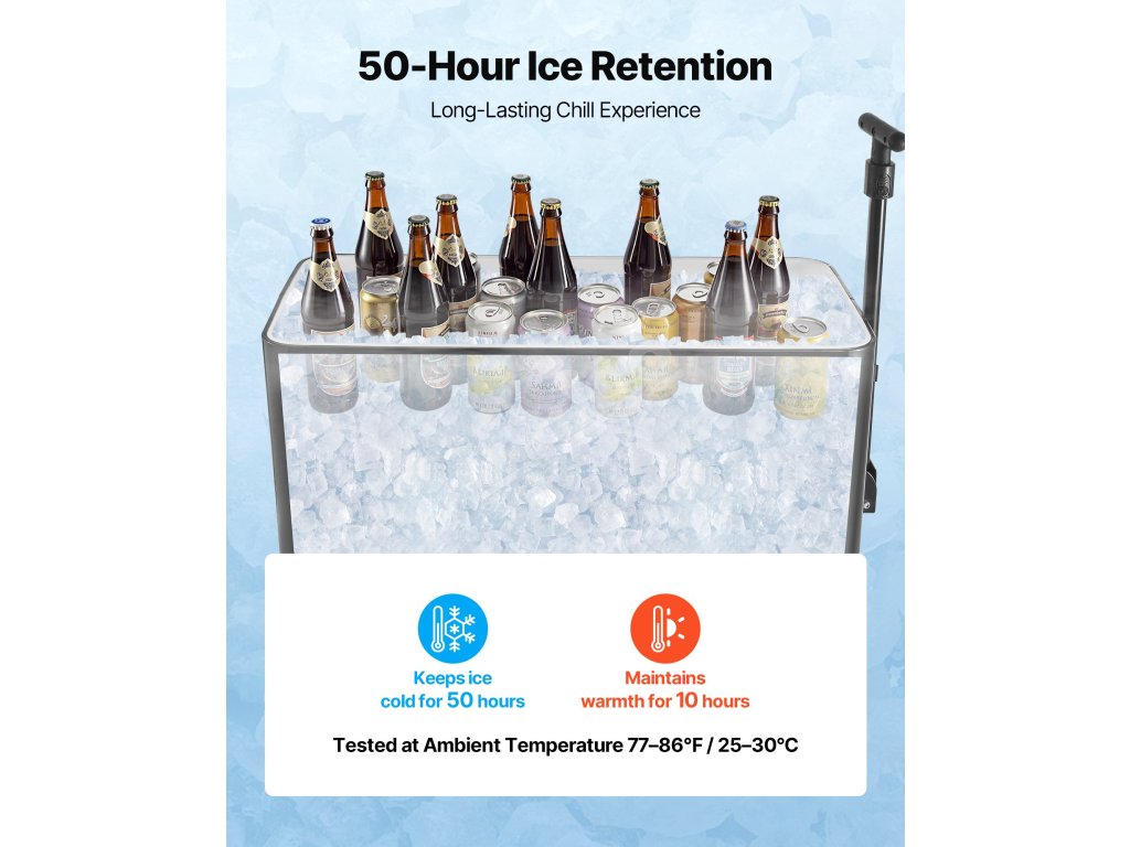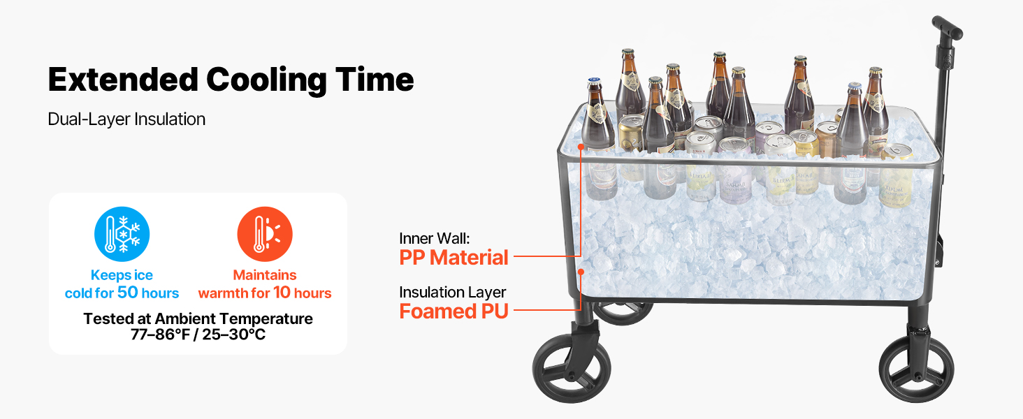 Náš pojazdný chladiaci vozík na ľad je vyrobený s vnútornou vložkou z PP a vysokoúčinnou izoláciou z PU peny, ktorá uzatvára studený vzduch. Udrží nápoje chladné až 50 hodín a teplé 10 hodín, vďaka čomu si môžete vychutnať ľadové nápoje aj počas horúcich letných dní.