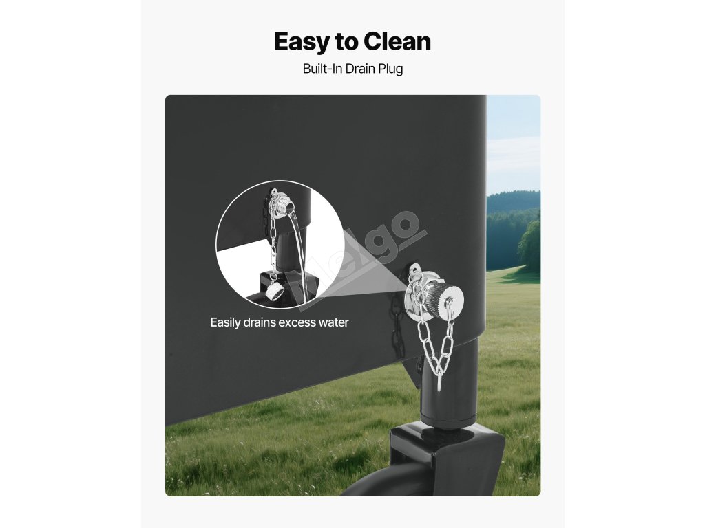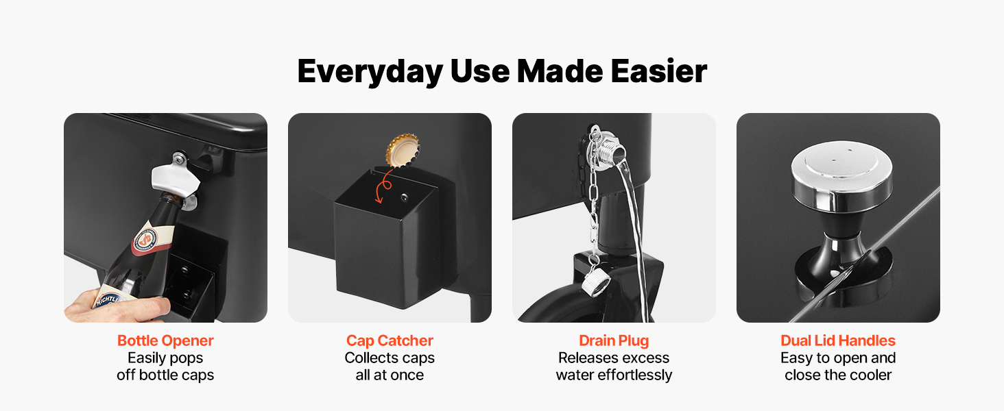 Vozík je vybavený zabudovaným zberačom uzáverov na fľaše, ktorý umožňuje udržiavať uzávery v poriadku, vypúšťacou zátkou na jednoduché vypúšťanie vody a dvojitými rukoväťami veka, ktoré sa ľahko otvárajú a zatvárajú, čo uľahčuje každodenné používanie.