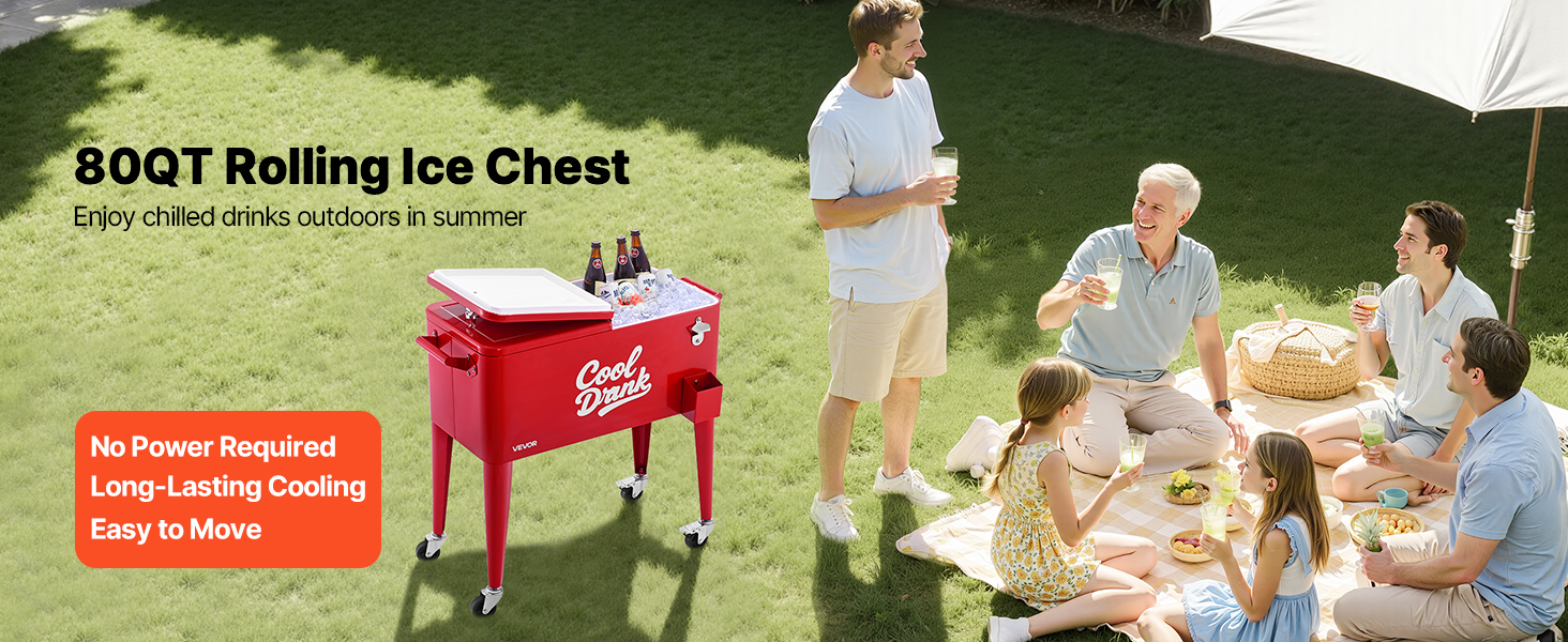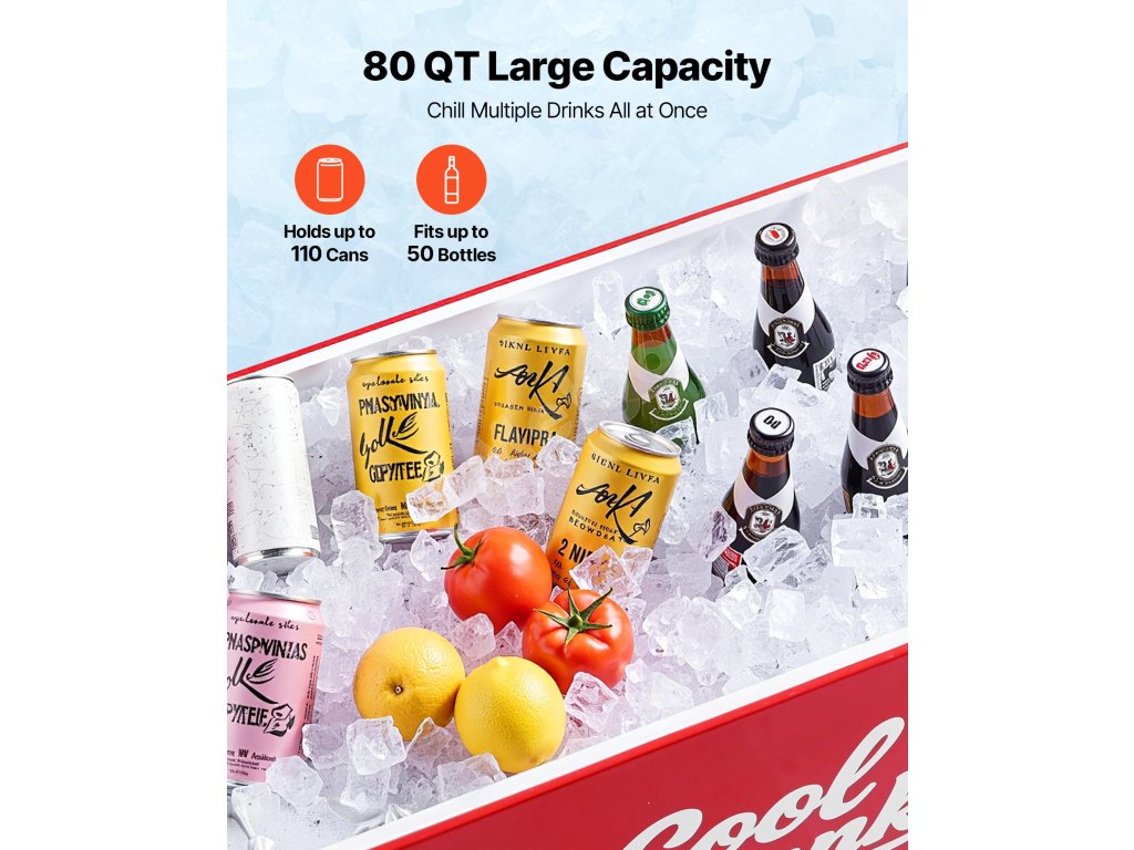 Tento vonkajší chladiaci vozík má veľkú kapacitu 80 QT, do ktorej sa zmestí veľa piva, nápojov a ľadu. Nepotrebuje elektrickú energiu, udržiava predmety chladné dlhé hodiny a ľahko sa premiestňuje, čím prináša osviežujúci pôžitok vonku.