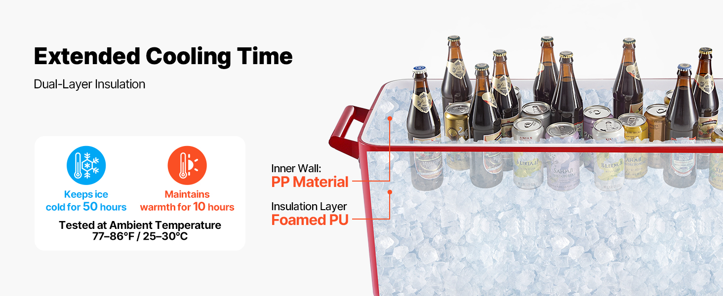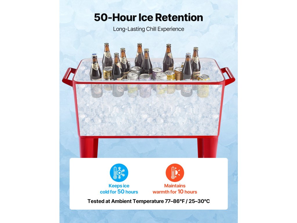 Náš pojazdný chladiaci vozík na ľad je vyrobený s vnútornou vložkou z PP a vysokoúčinnou izoláciou z PU peny, ktorá uzatvára studený vzduch. Udrží nápoje chladné až 50 hodín a teplé 10 hodín, vďaka čomu si môžete vychutnať ľadové nápoje aj počas horúcich letných dní.