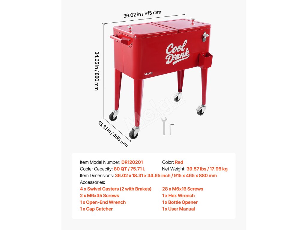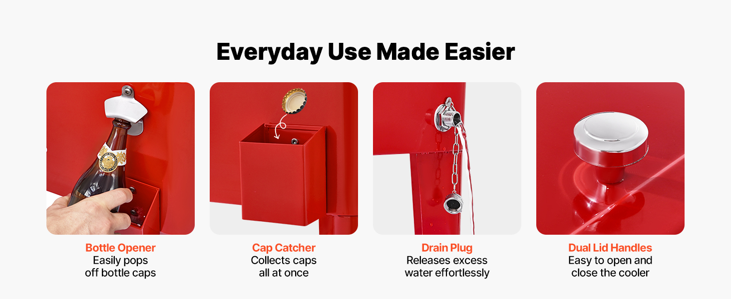 Vozík je vybavený zabudovaným otváračom na fľaše a zberačom uzáverov na udržiavanie poriadku v uzáveroch, vypúšťacou zátkou na rýchle vypúšťanie vody a dvojitými úchytmi veka na hladké otváranie a zatváranie, vďaka čomu je každodenné používanie pohodlnejšie.
