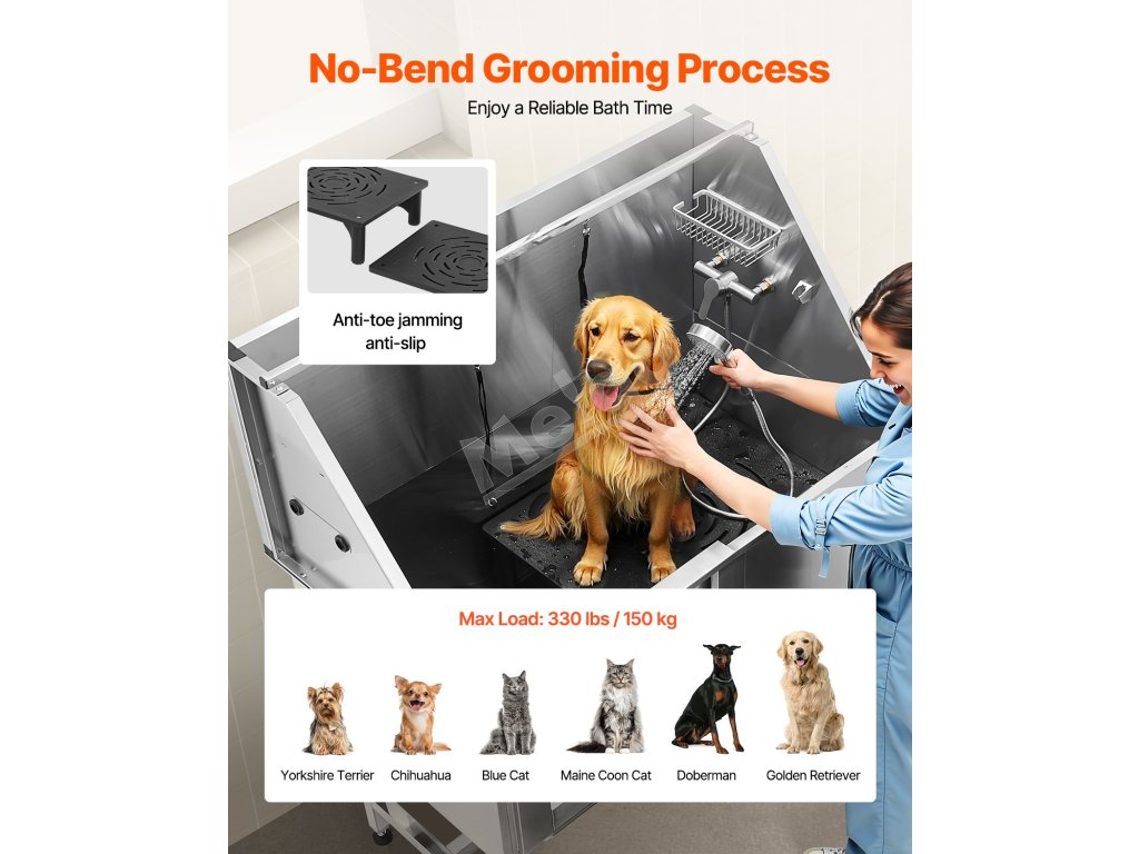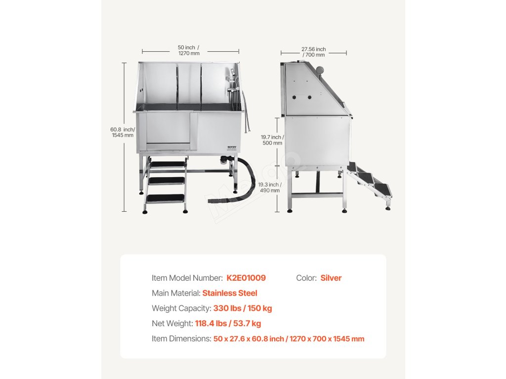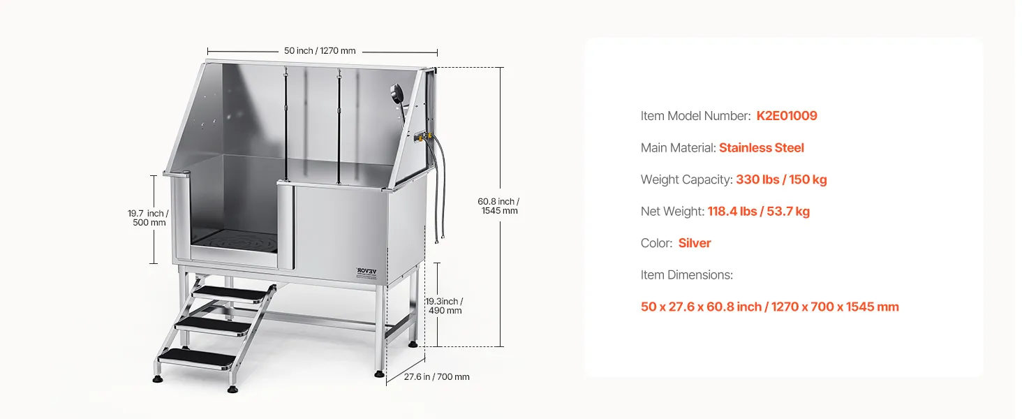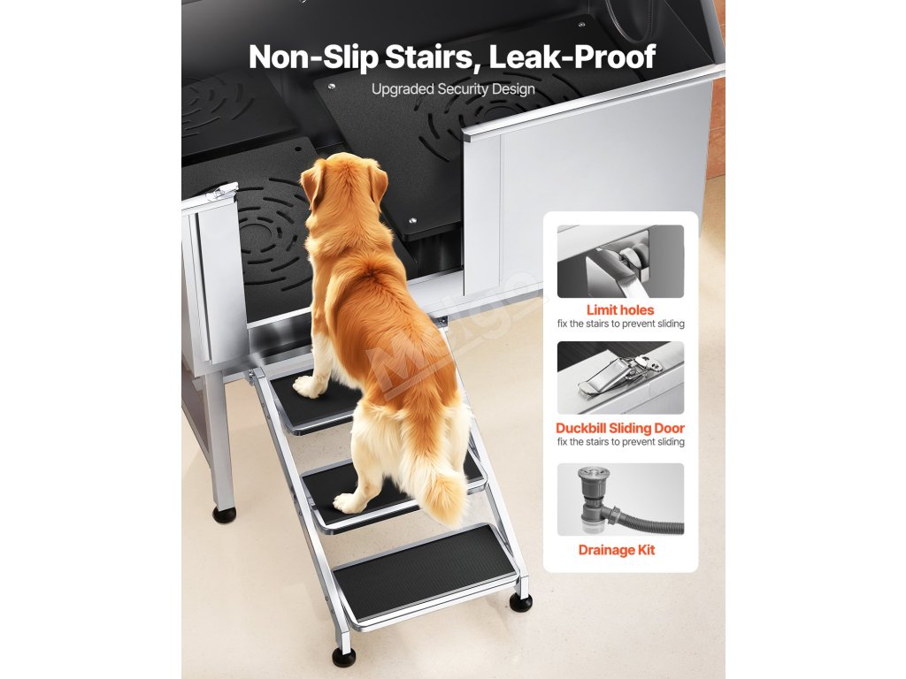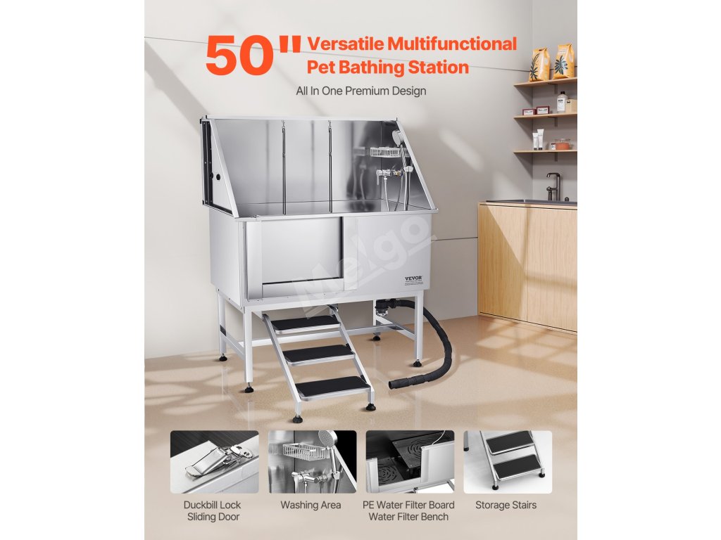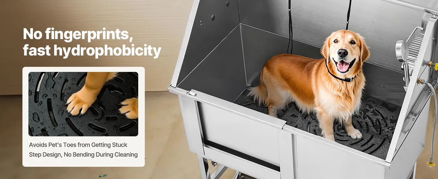 Táto vaňa zaručuje, že voda neuniká. Je vyrobená z nehrdzavejúcej ocele, je odolná voči korózii a robustná, pričom si časom zachová svoj nový vzhľad. Vanička má hladké okraje, ktoré zaisťujú bezpečnosť domácich zvierat aj používateľov počas kúpania.