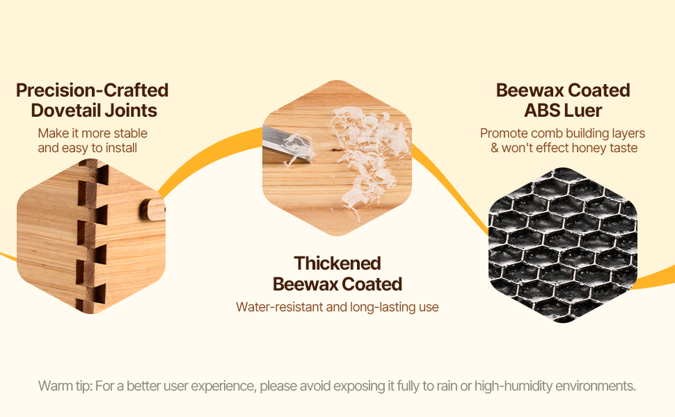 Naše úle potiahnuté prírodným včelím voskom a rámikmi úľa z ABS ponúkajú nielen vodotesný a ľahko čistiteľný povrch, ale voskovým povlakom aj priťahujú a upokojujú včely, čím znižujú pravdepodobnosť rojenia.