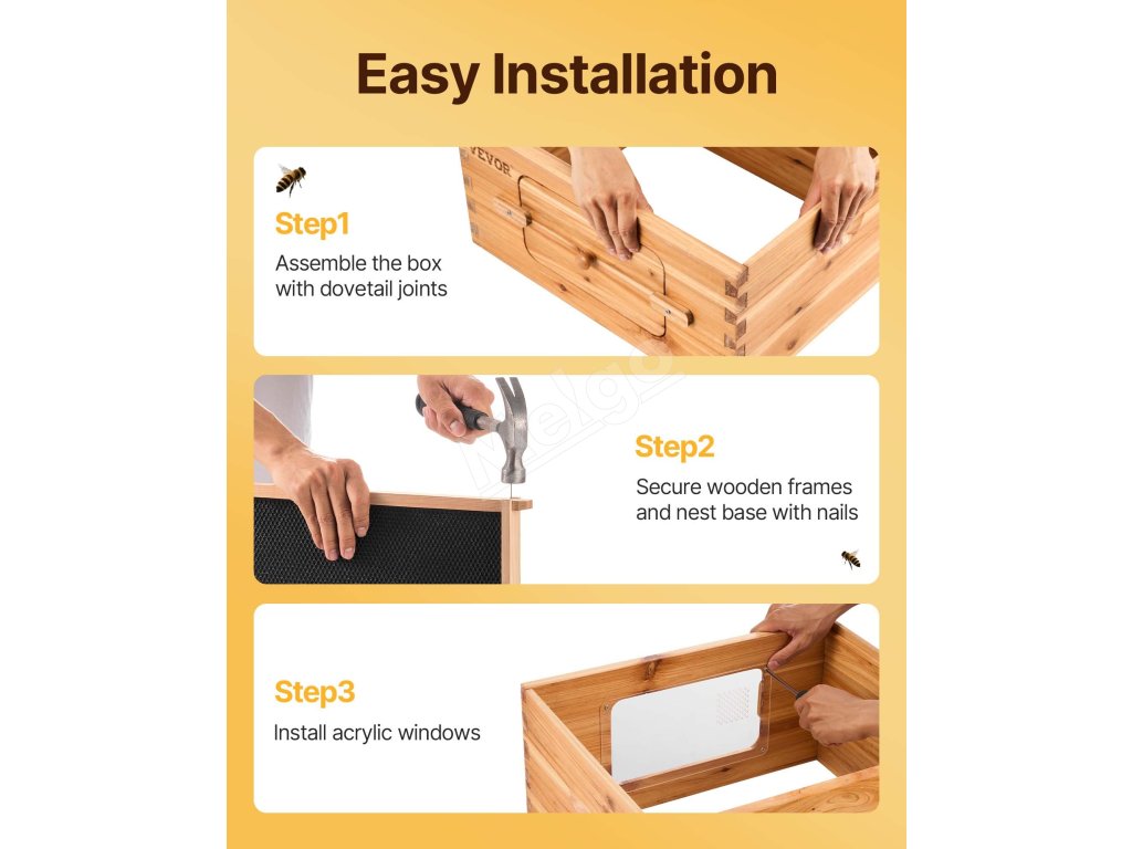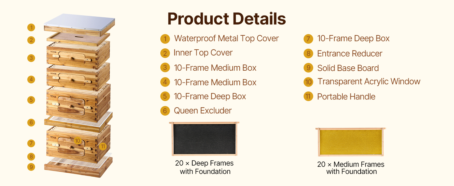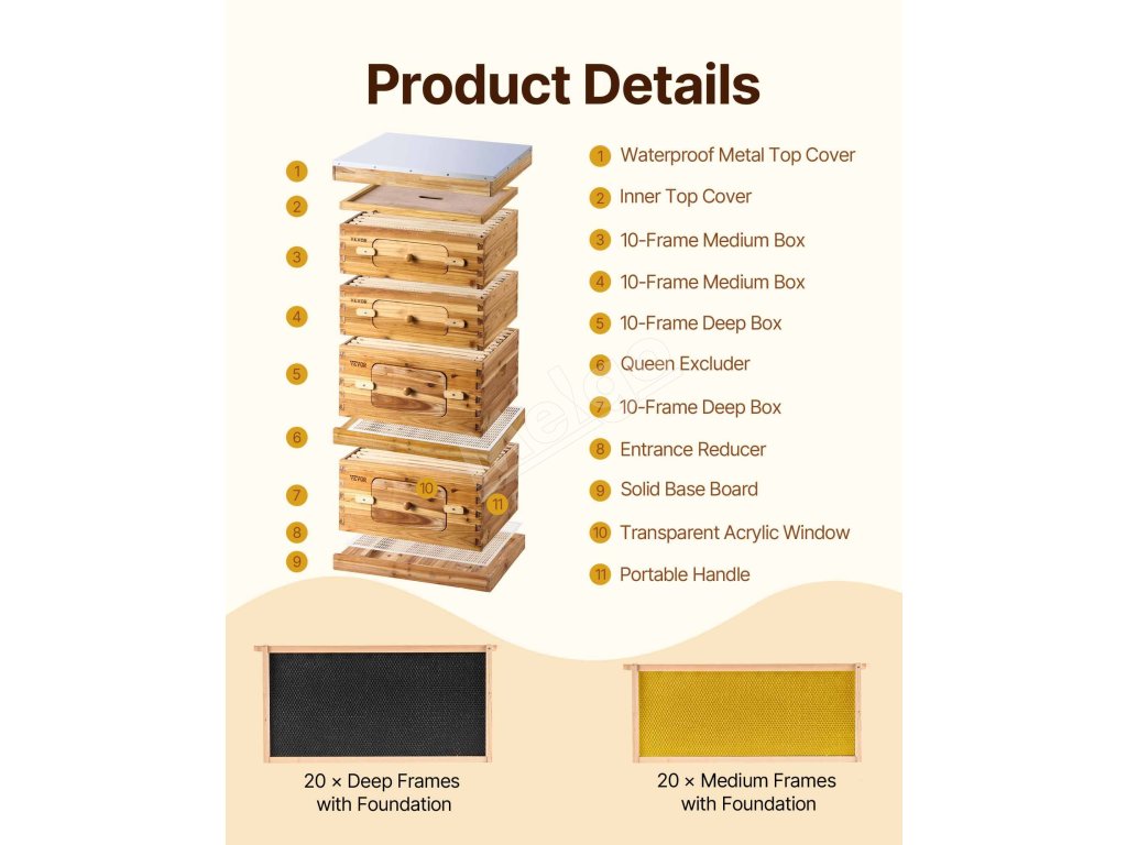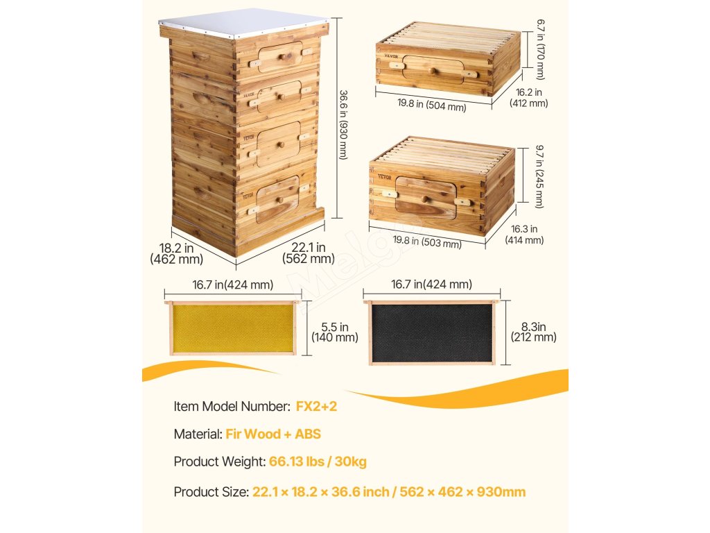 Tento úľ je vyrobený z hrubého cédrového dreva pomocou holubičieho chvosta a má priehľadné okienka pre včely na vetranie a ľahké pozorovanie. Priestranná konštrukcia zabezpečuje zdravie včiel a vyššiu úrodu. Je to ideálna voľba pre vaše včelárske potreby.
