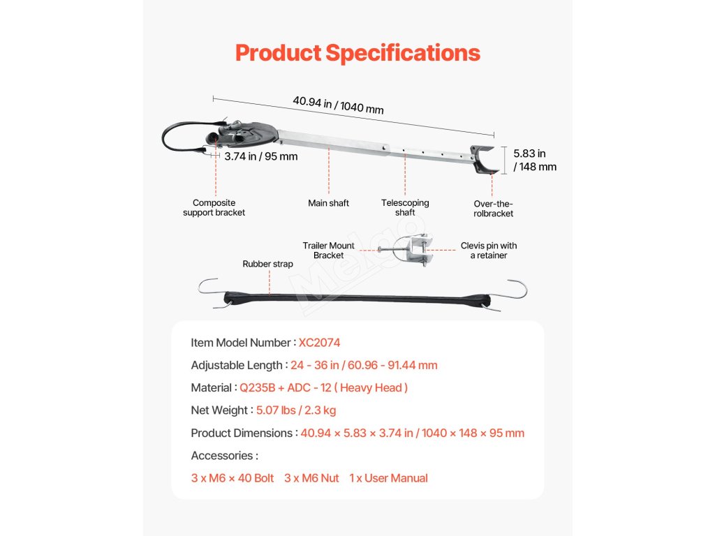 Držiak záchranného priečnika má nastaviteľnú dĺžku, vďaka čomu je kompatibilný s rôznymi typmi prívesov. Nastaviteľná konštrukcia umožňuje prispôsobenie na mieru, čím zabezpečuje bezpečné a stabilné upevnenie na rôzne konfigurácie lodí a prívesov.