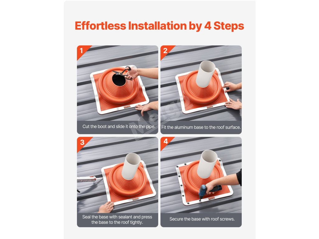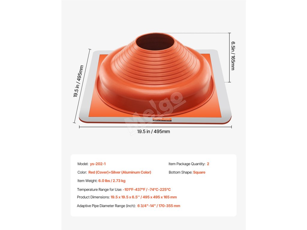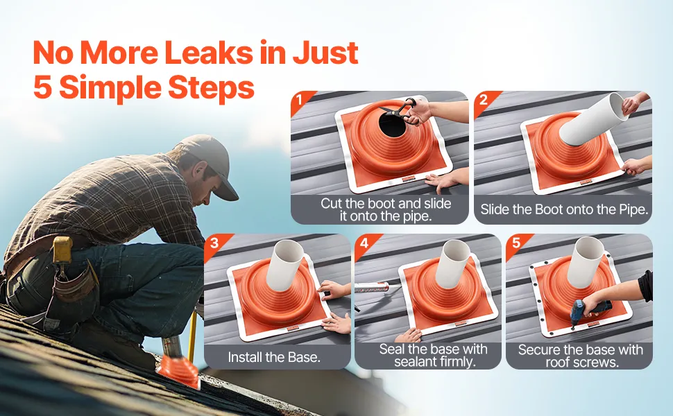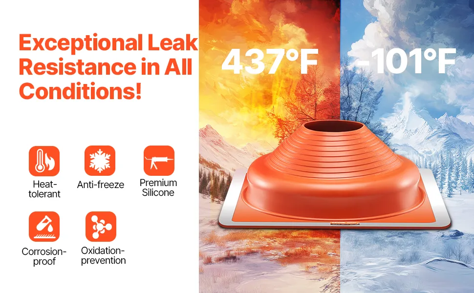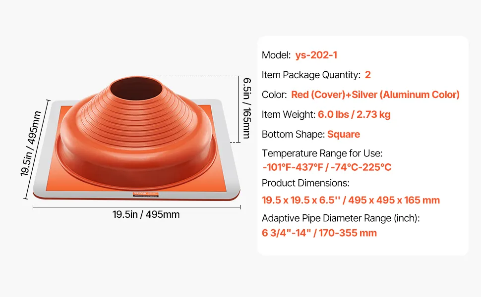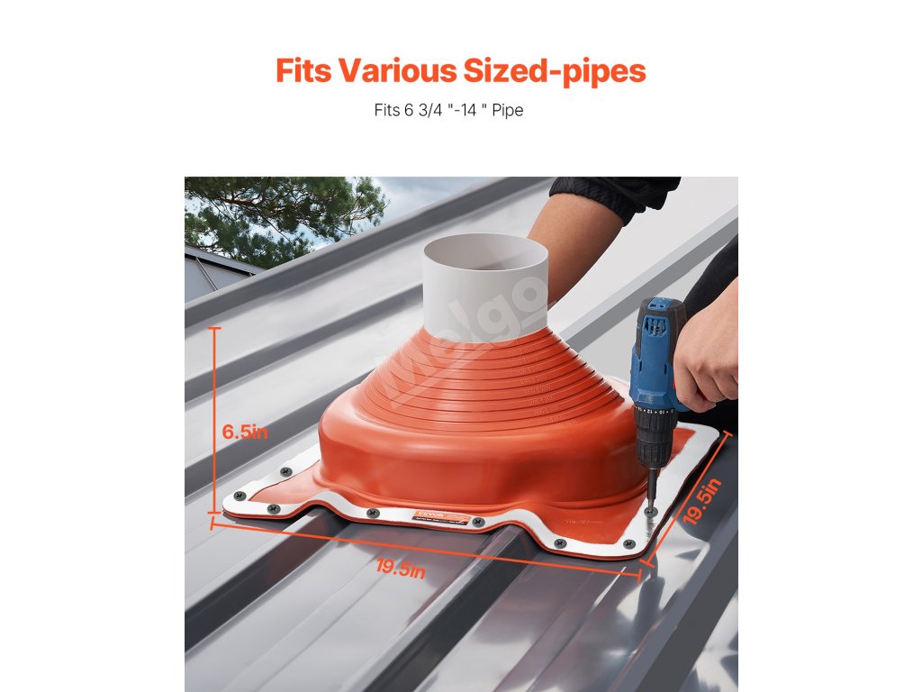 Obal na strešné rúry je vhodný pre rúry s priemerom od 6-3/4" do 14". Vďaka silikónovému krytu odolnému voči korózii odolá vysokým teplotám a nízkym mrazom. Pružná hliníková základňa uľahčuje rezanie a inštaláciu, zvládne rôzne strešné materiály a sklony. Odolné & tesné tesnenie, je to vaša ideálna voľba pre úniky strešných rúr.