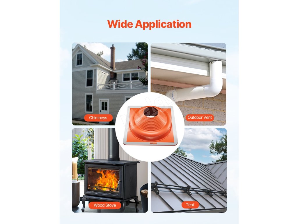 Vďaka vysokej prispôsobivosti a dobrému utesneniu našej vysokoteplotnej flexibilnej potrubnej topánky sa môže strešná vetracia potrubná topánka široko používať v komínoch, výfukových otvoroch, kachliach na drevo, otvoroch na potrubie, stanových rúrach atď!