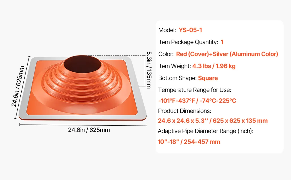 Obal na strešné rúry je vhodný pre rúry s priemerom 10" až 18". Vďaka silikónovému krytu odolnému voči korózii prekonáva vysoké teploty a nízke mrazy. Flexibilná hliníková základňa umožňuje jednoduché rezanie & inštaláciu, zvládne rôzne strešné materiály a sklony. Odolná & tesne tesniaca, je ideálnou voľbou pre netesnosti strešných rúr.