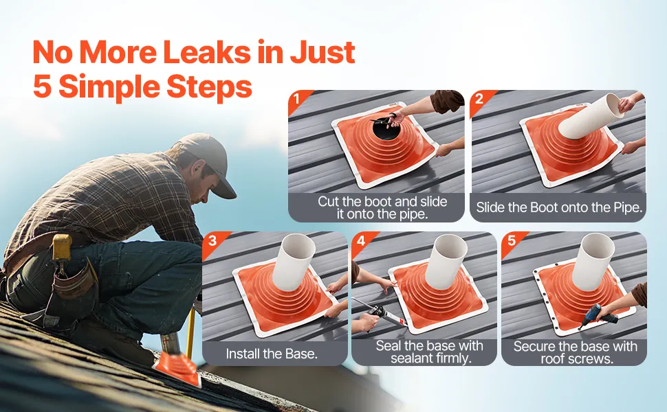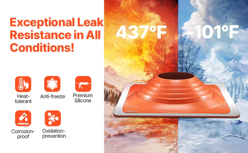 Vďaka vysokej prispôsobivosti a dobrému utesneniu našej vysokoteplotnej flexibilnej potrubnej topánky sa môže strešná vetracia potrubná topánka široko používať v komínoch, výfukových otvoroch, kachliach na drevo, potrubných otvoroch, stanových rúrach atď!