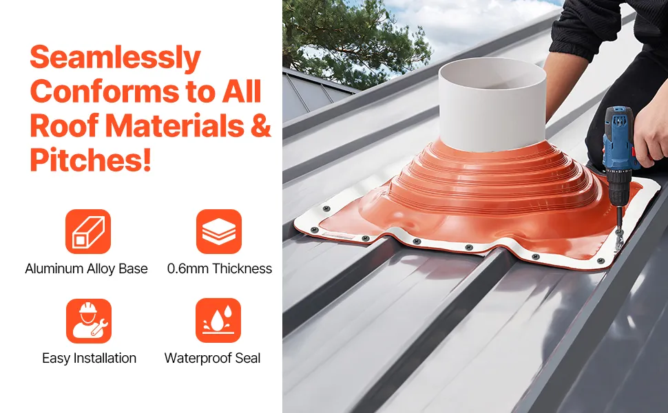 Kovová objímka na strešné potrubie je vyrobená so základňou z hliníkovej zliatiny s hrúbkou 0,6 mm, ktorá je vysoko flexibilná a zabezpečuje tesné priľnutie k vašej streche a potrubiu pre lepší tesniaci výkon!
