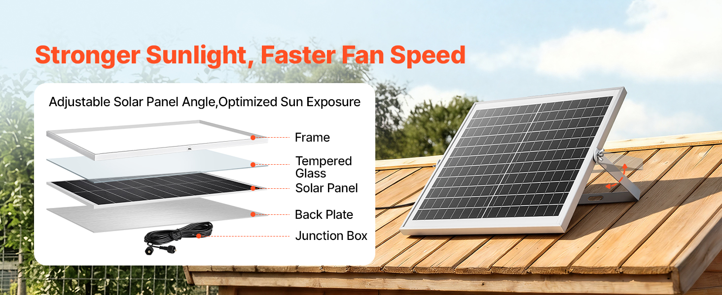 Automaticky sa prispôsobuje intenzite slnečného žiarenia. Silnejšie slnko vedie k vyššej rýchlosti ventilátora. Tvrdené sklo, stabilný rám a efektívna konštrukcia vrstiev článkov pomáhajú udržiavať stabilný výkon.