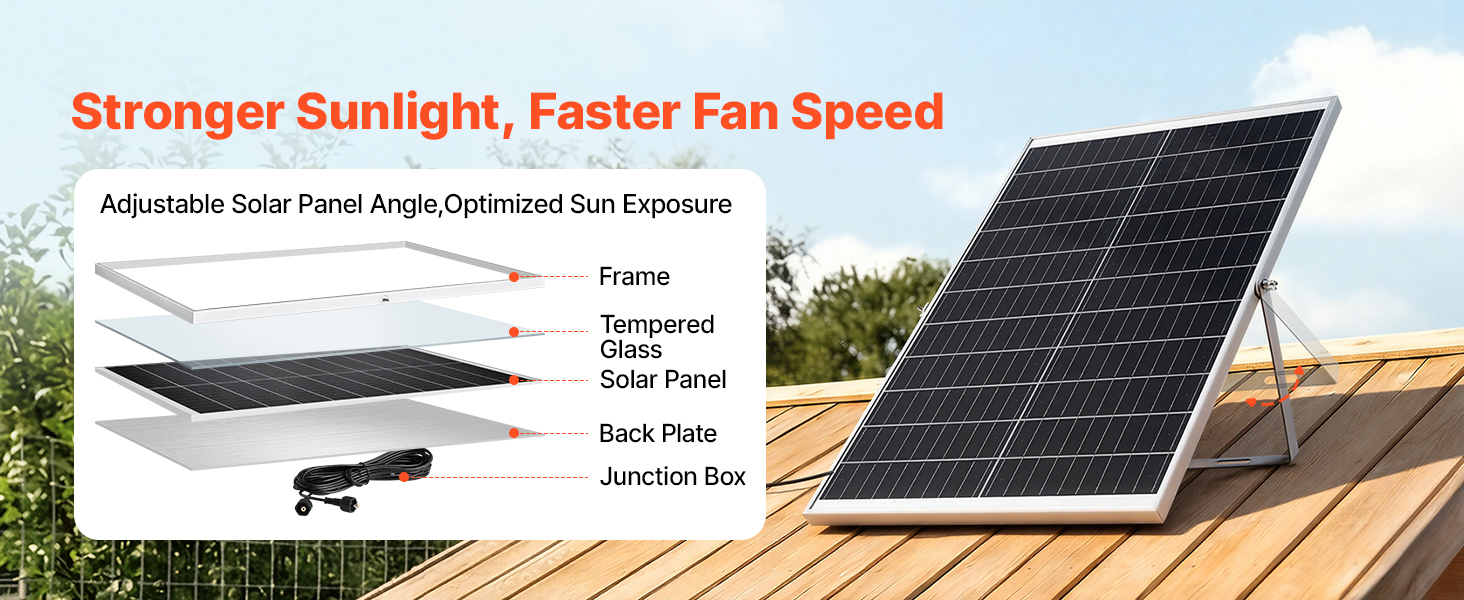 Automaticky sa prispôsobuje intenzite slnečného žiarenia. Silnejšie slnko vedie k vyššej rýchlosti ventilátora. Tvrdené sklo, stabilný rám a efektívna konštrukcia vrstiev článkov pomáhajú udržiavať stabilný výkon.