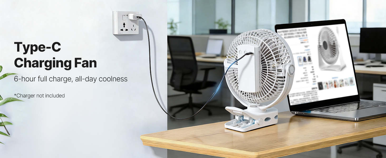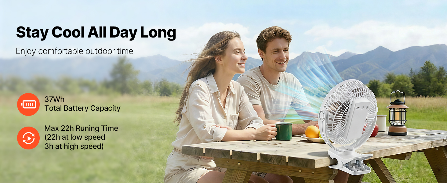 Od ranného čítania až po nočný spánok si užite celodenné chladenie bez častého dobíjania. Poskytuje až 22 hodín prevádzky pri nízkej rýchlosti (testované údaje), čo z tohto malého ventilátora s klipom robí spoľahlivého spoločníka na celú noc.