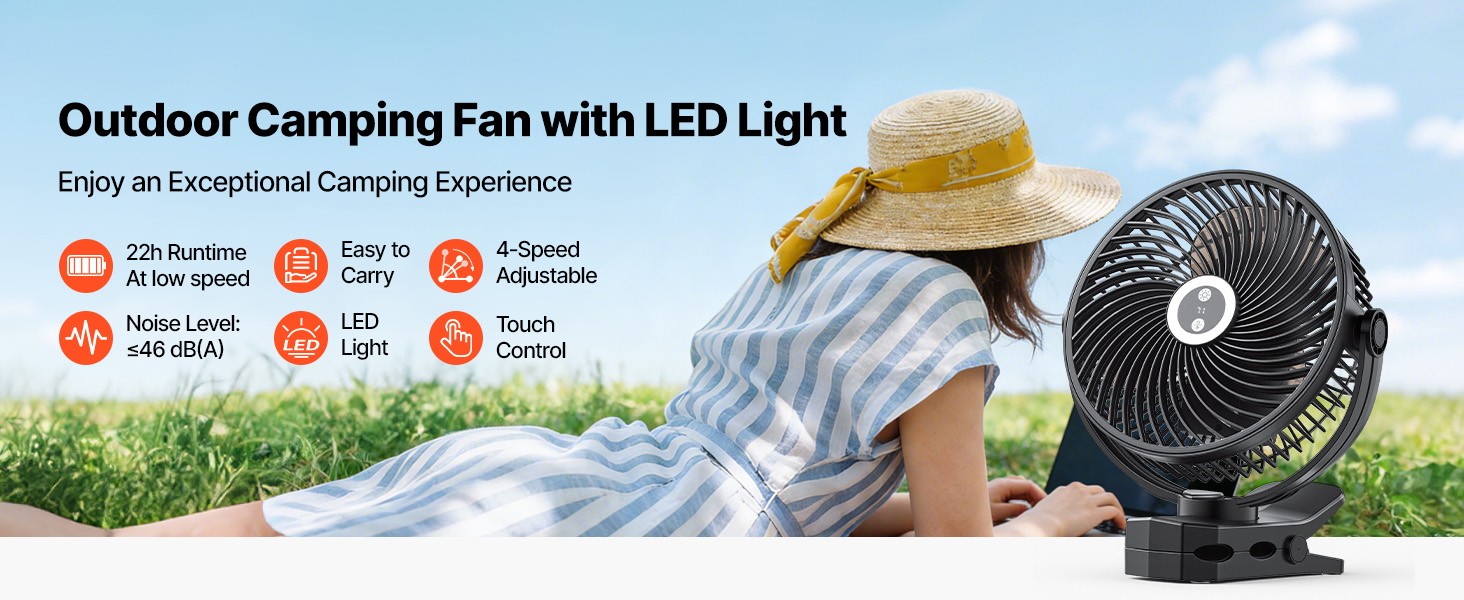 Tento prenosný ventilátor s klipom je vybavený 2-stupňovým LED kempingovým osvetlením a 4-rýchlostným inteligentným ventilátorom a disponuje dotykovým panelom s displejom zobrazujúcim stav batérie v reálnom čase. Použite ho ako stolný ventilátor s klipom na čítanie a osvetlenie alebo ho pripevnite na okraj stanu ako tichý ventilátor na behanie alebo spoločníka na spanie pre väčší komfort.
