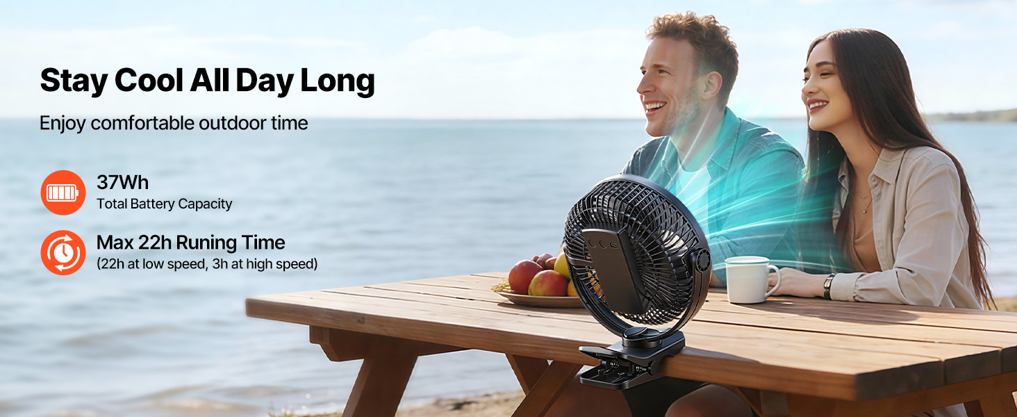 Pri nízkej rýchlosti tento malý ventilátor s klipom beží až 22 hodín (testované údaje), čím zabezpečuje nerušený spánok. Dve úrovne jasu LED umožňujú ľahké prepínanie medzi jasným osvetlením a jemným nočným svetlom, čo ho robí ideálnym medzi univerzálnymi ventilátormi s klipom.