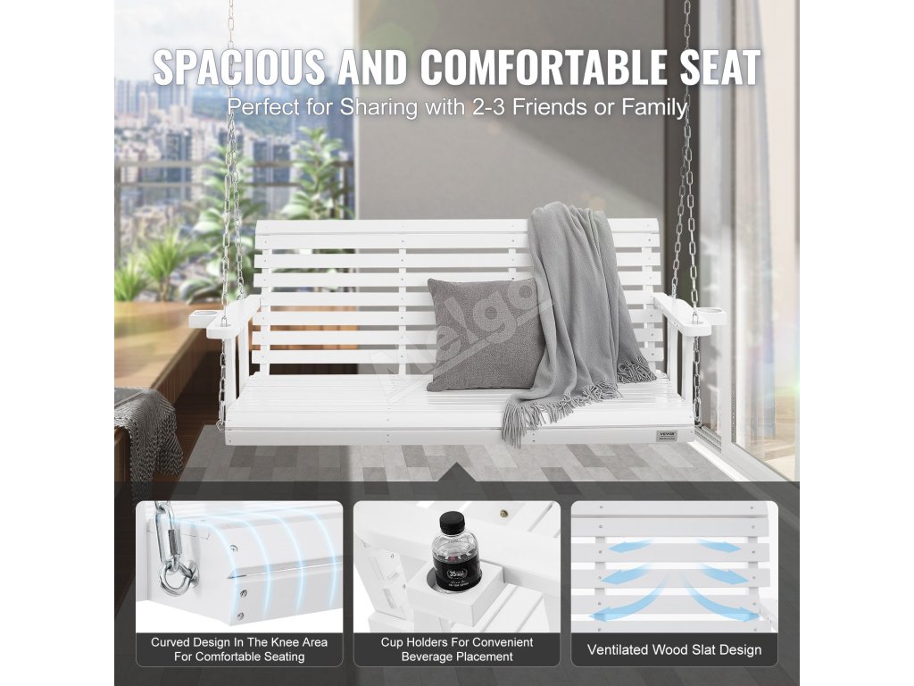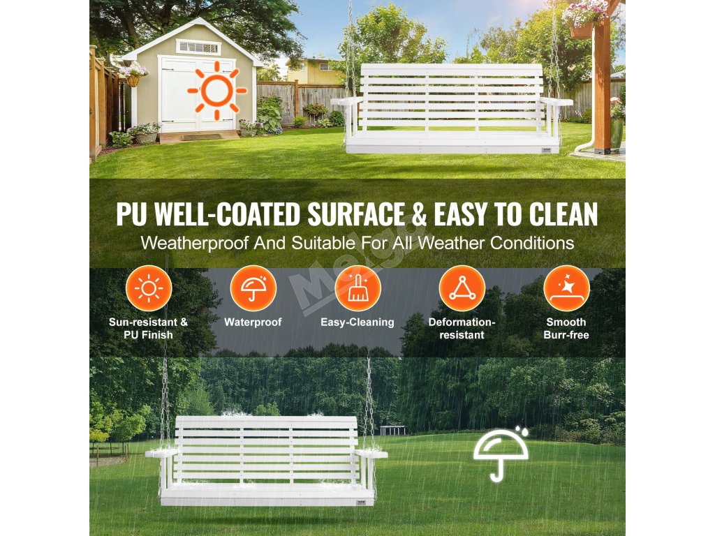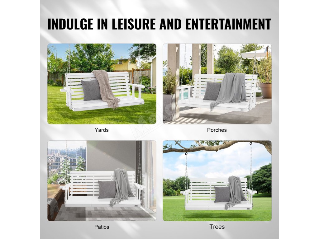 Drevená verandová hojdačka VEVOR je ideálna pre rôzne vonkajšie prostredie. Svojím elegantným dizajnom skrášli záhrady, dvory a terasy. Jej biela farba jej dodáva sofistikovanosť. Ľahko ju môžete kombinovať s akýmkoľvek existujúcim interiérom. Či už visí na pergole alebo na pevných trámoch, vyzerá skvele. Táto hojdačka je nielen funkčná, ale zároveň dodáva estetickú hodnotu vášmu priestoru. Je dôležitým ústredným bodom, ktorý zlepšuje krásu vášho vonkajšieho priestoru. Vychutnávajte si pobyt vonku vo veľkom štýle s touto elegantnou hojdačkou.