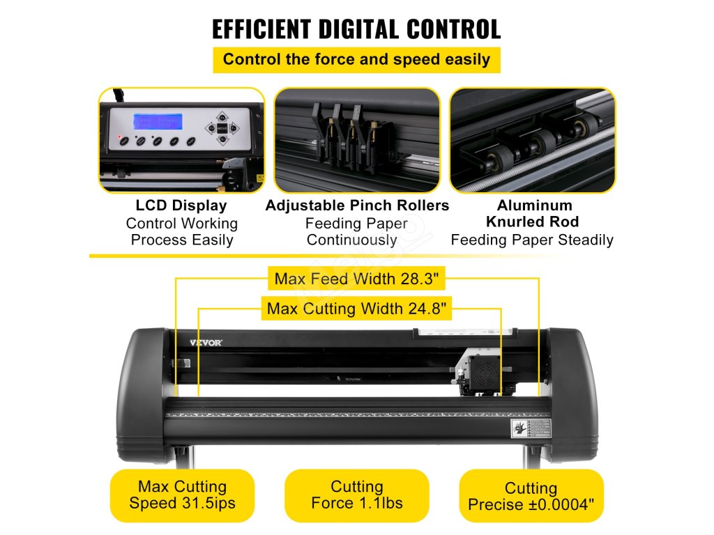 LCD a digitálny ovládací panel nastavujú rezací výkon a rýchlosť, aby sa dosiahlo presnejšie a kontrolovanejšie rezanie v našej rezačke na vinyl. Rezací výkon môže dosiahnuť 1,1 libry. Tri nastaviteľné valčeky s dvojitou pružinou zabezpečujú, že plotrová rezačka dosahuje šírku podávania 28,3 palca a rýchlosť rezania 31,5 ips.