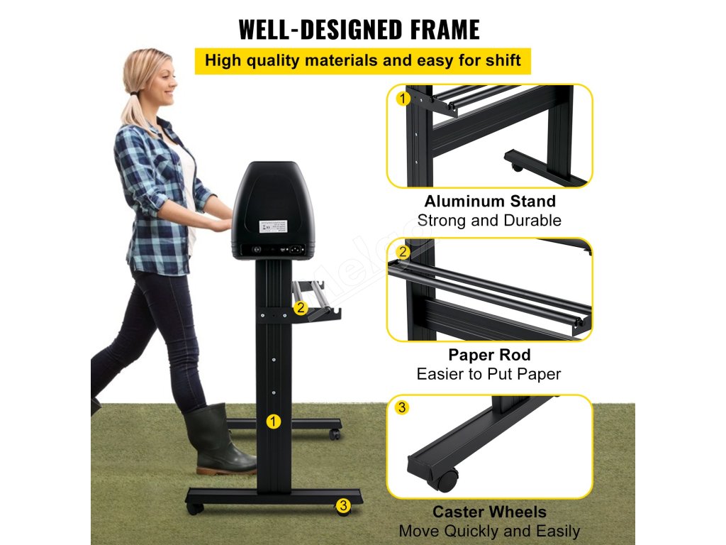 Plotrový rezač vinylov so stojanom má kompaktnú veľkosť, ale pevný rám z hliníkovej zliatiny. Papierová tyč a kolieska vám pomáhajú pracovať ľahšie a efektívnejšie.