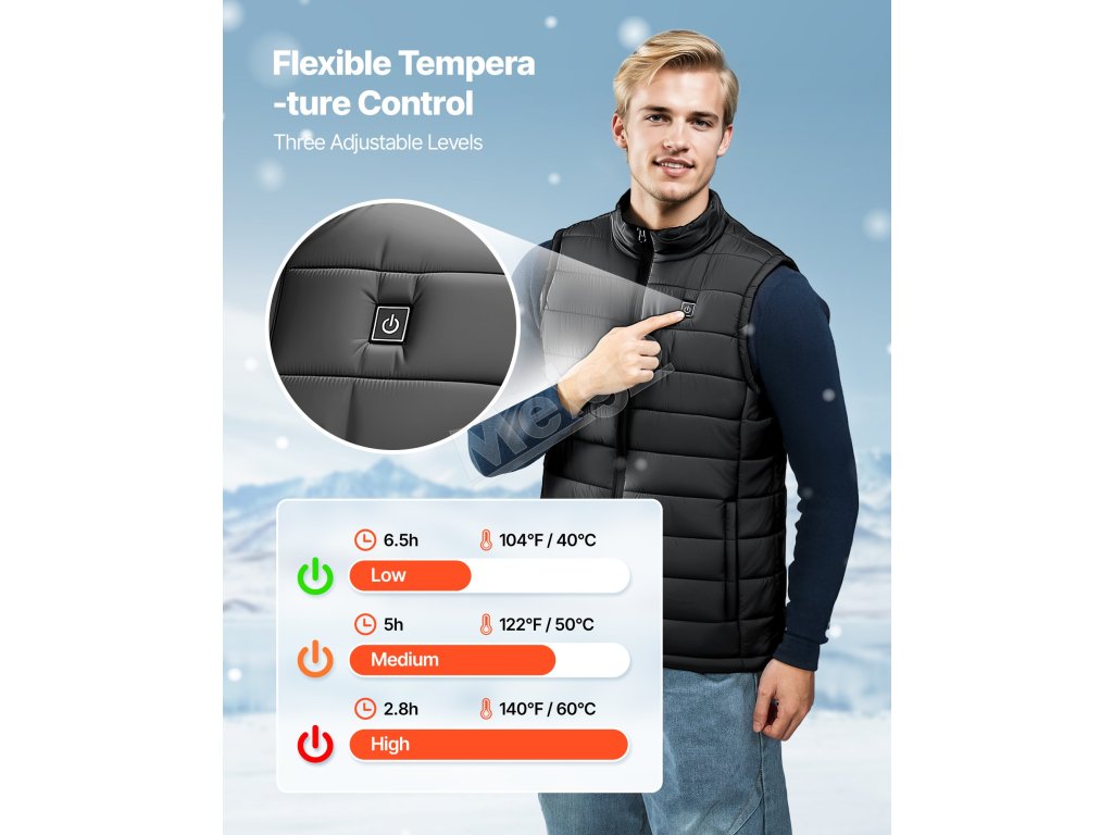 Táto pánska vyhrievaná vesta podporuje 3 nastaviteľné úrovne teploty, takže si môžete flexibilne nastaviť pohodlnú teplotu podľa potreby. Poskytuje nepretržité teplo do oblastí jadra, čo umožňuje celodenné teplo bez vrstvenia viacerých hrubých odevov.