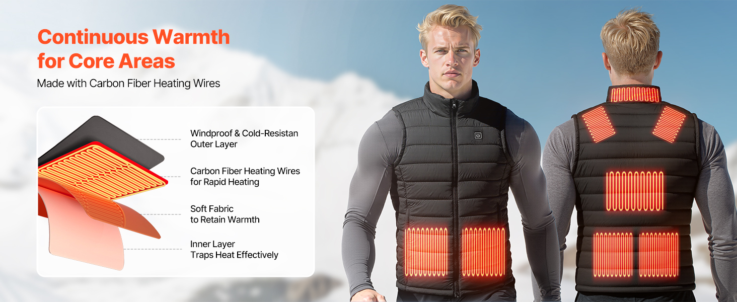 Vďaka vonkajšej vrstve odolnej proti vetru a chladu a vnútornej vrstve s vyhrievacími drôtmi z uhlíkových vlákien táto vyhrievaná vesta pre mužov rovnomernejšie rozvádza teplo a rýchlo hreje. Jej mäkká termálna tkanina uzamyká teplo pre lepší hrejivý efekt.