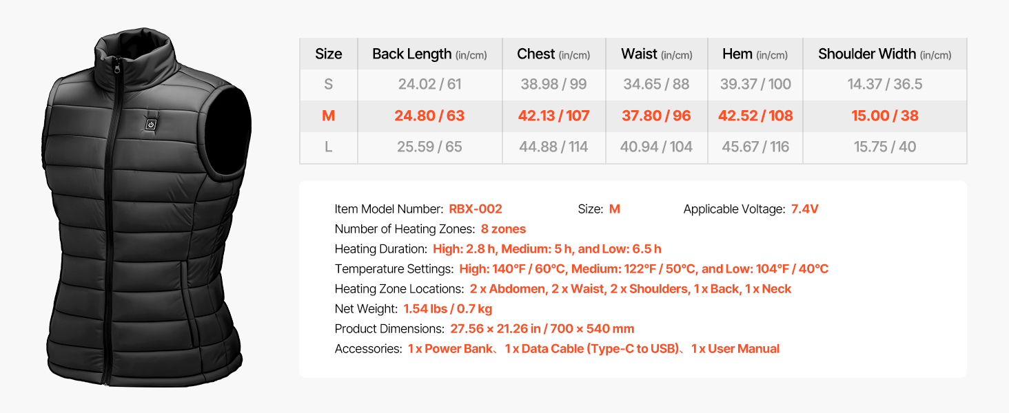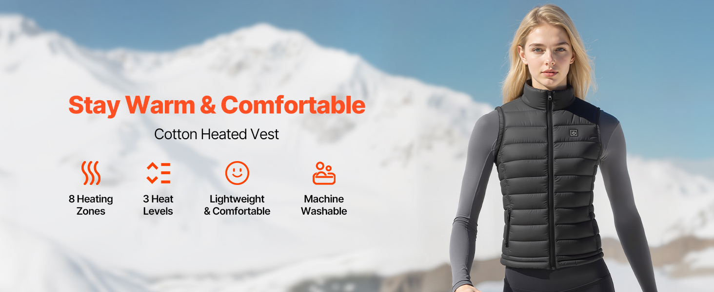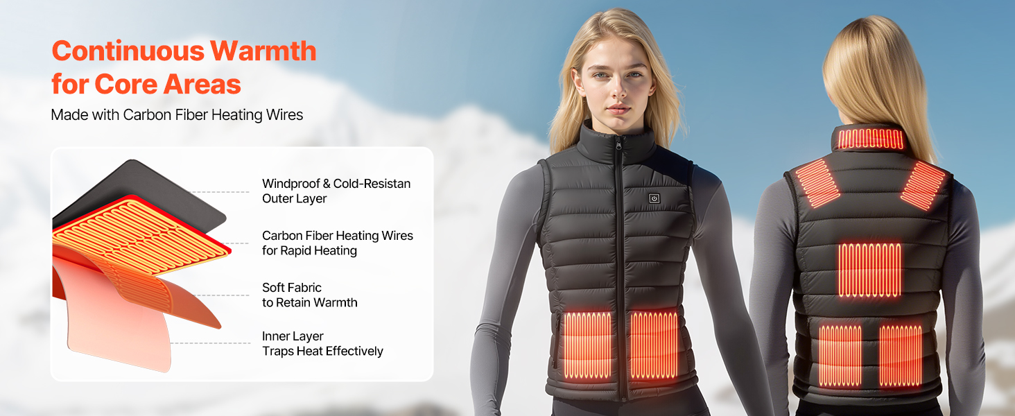 Vďaka vonkajšej vrstve odolnej proti vetru a chladu a vnútornej vrstve s vyhrievacími drôtmi z uhlíkových vlákien táto vyhrievaná vesta pre ženy rovnomernejšie rozvádza teplo a rýchlo hreje. Jej mäkká termálna tkanina uzamyká teplo pre lepší hrejivý efekt.