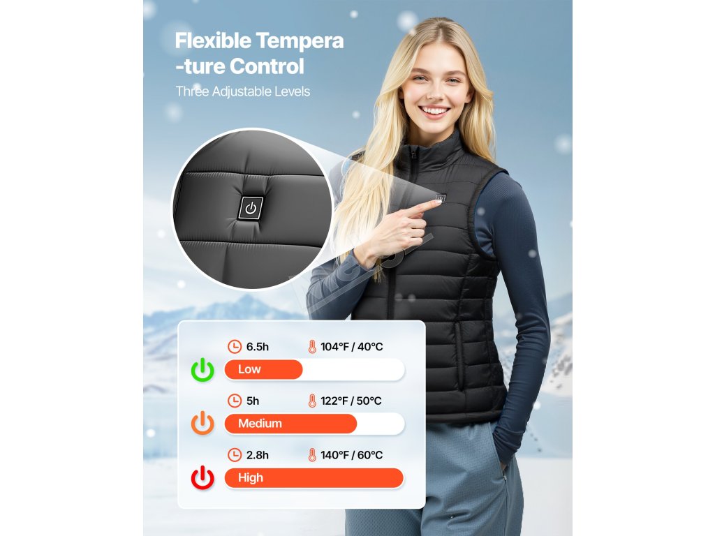 Táto vyhrievaná vesta pre ženy podporuje 3 nastaviteľné úrovne teploty, takže si môžete flexibilne nastaviť pohodlnú teplotu podľa potreby. Poskytuje nepretržité teplo do oblastí jadra, čo umožňuje celodenné teplo bez vrstvenia viacerých hrubých odevov.