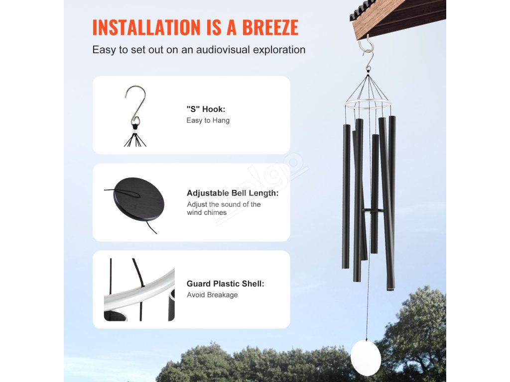 Naše zvonkohry do exteriéru s veľkou čiernou kovovou konštrukciou 1677 mm obsahujú 6 hliníkových trubíc, ktoré vydávajú tlmenú melódiu C dur. Hodí sa do záhrady, na balkón, terasu a ako dekorácia do domácnosti, je ideálnou voľbou na Deň matiek alebo Vianoce pre vašu milovanú.