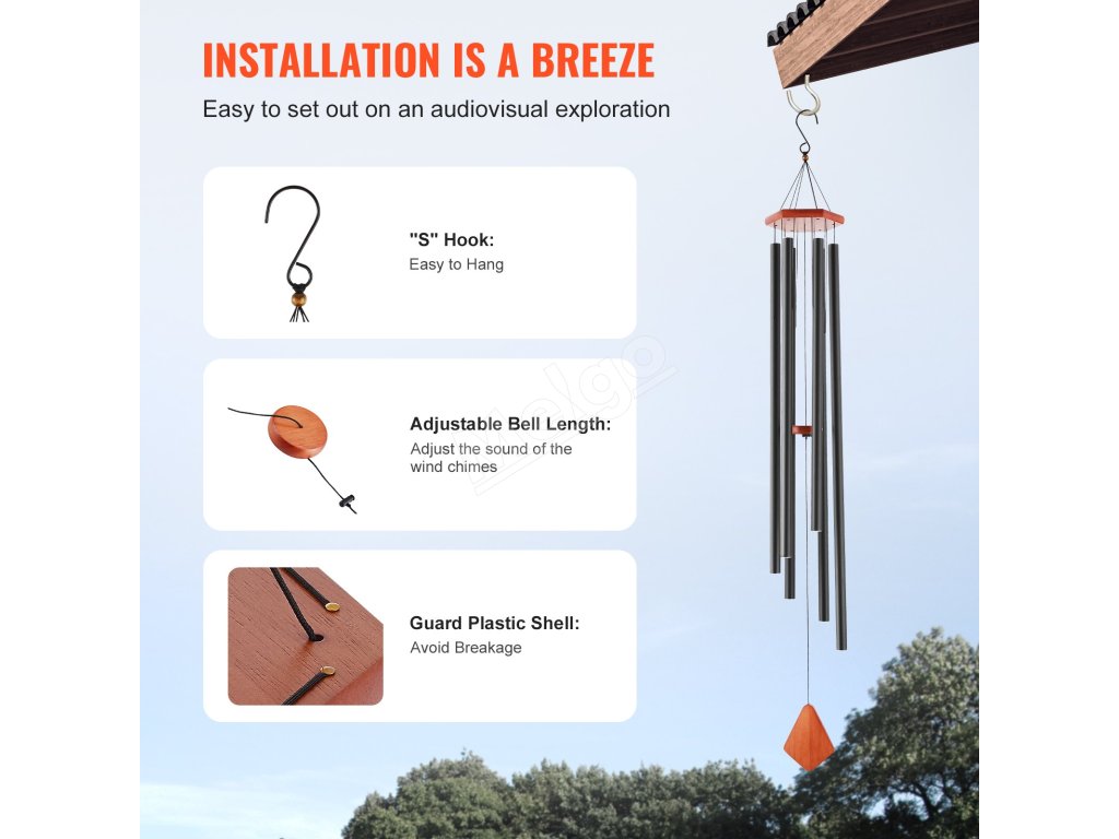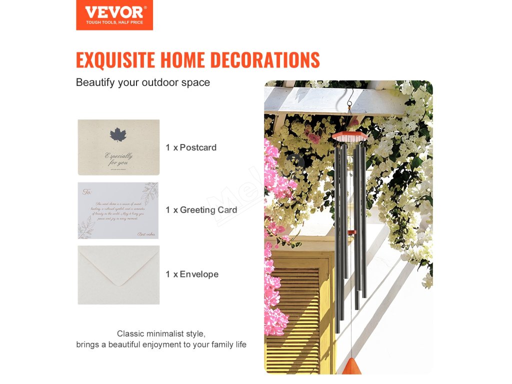 Naše zvonkohry do exteriéru s veľkou čiernou kovovou konštrukciou 1524 mm obsahujú 6 hliníkových trubíc, ktoré vydávajú tlmenú melódiu A dur. Hodí sa do záhrady, na balkón, terasu a ako dekorácia do domácnosti, je ideálnou voľbou na Deň matiek alebo Vianoce pre vašu milovanú.