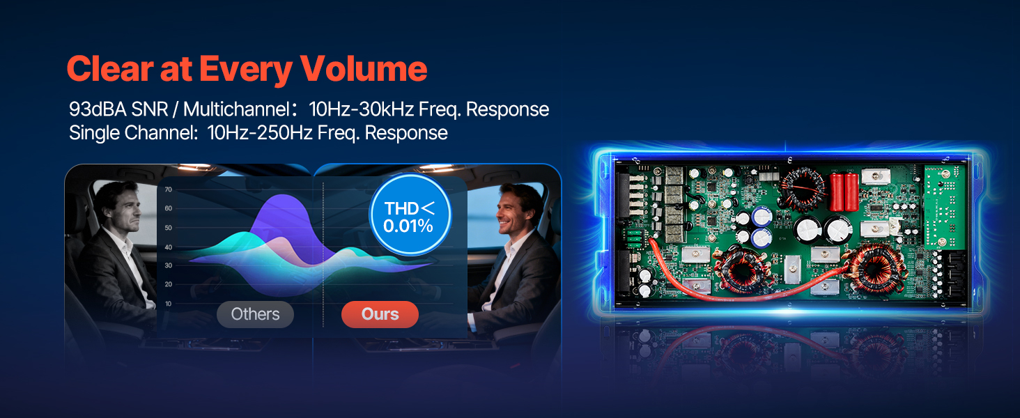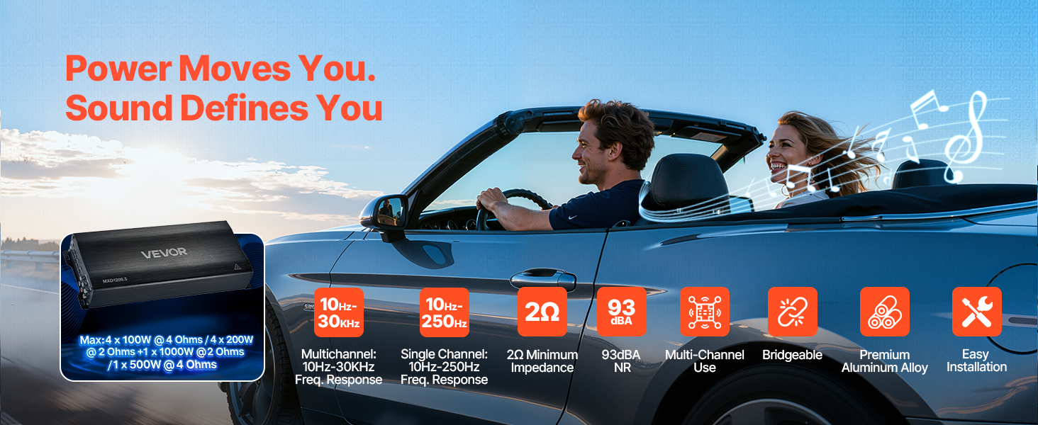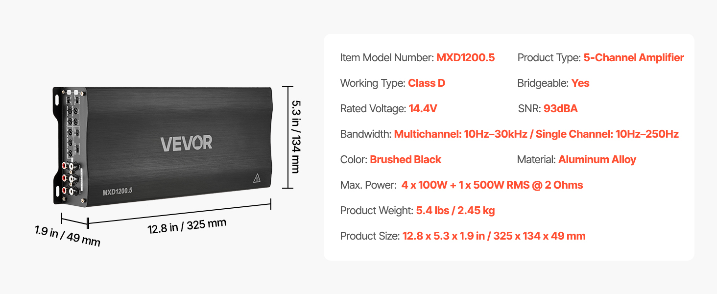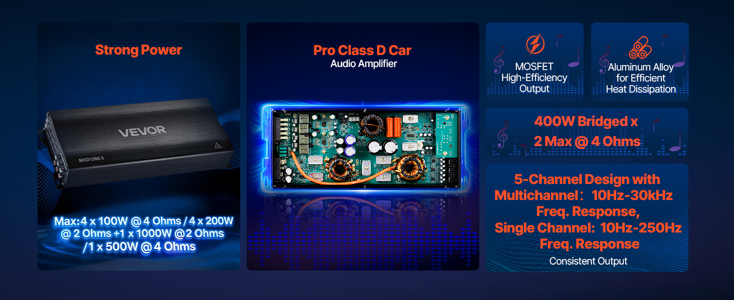 Tento viackanálový zosilňovač pre autorádio ponúka vysoký výkon, čistý zvuk s nízkym skreslením a mostovateľné kanály. Vďaka vysokému pomeru signálu k šumu, plynulému výkonu triedy D a odvodu tepla z hliníkovej zliatiny sa hodí do rôznych vozidiel a ľahko sa inštaluje – je ideálny pre každodenné jazdenie aj pre audio nadšencov.