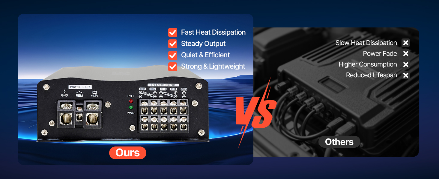 Tento 5-kanálový automobilový zosilňovač kombinuje výkonný výkon s rýchlo chladiacou hliníkovou konštrukciou, aby poskytoval čistý, bohatý a pohlcujúci zvuk pri každej jazde. Osviežuje dlhé cesty, znižuje únavu z jazdy a zvyšuje váš zážitok z audia v aute s trvalou čistotou a komfortom.