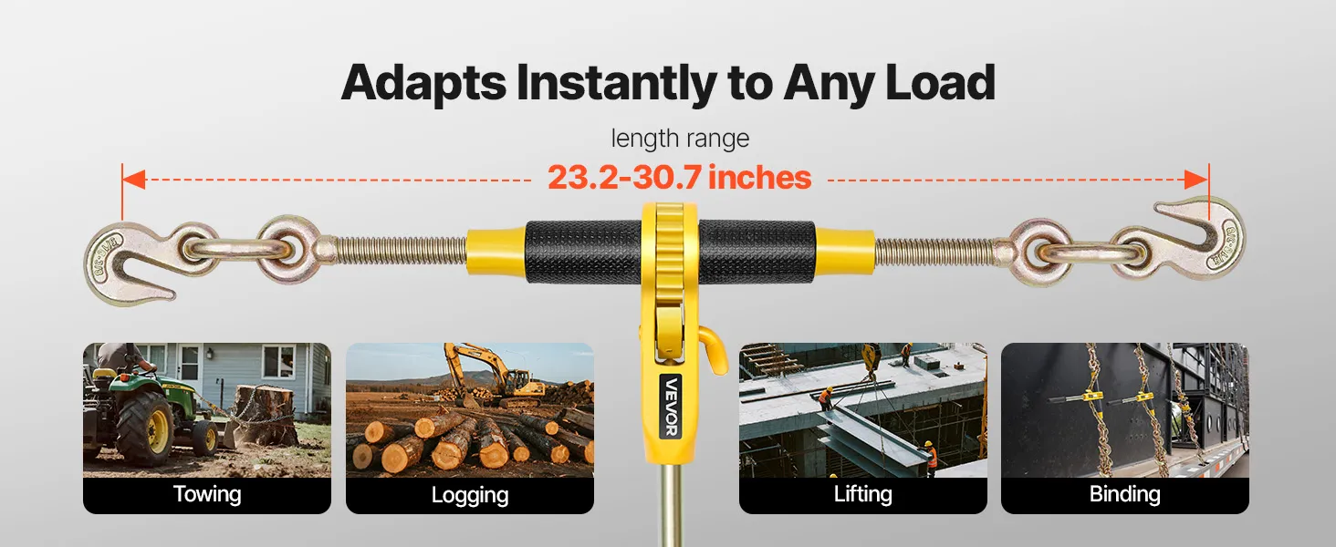 Odpoveď: Nastavuje sa od 23,2 palca (min.) do 30,7 palca (max.). Vhodný pre reťaze s priemerom 5/16 až 3/8 palca - ideálny na ťažbu dreva, viazanie a prepravu.