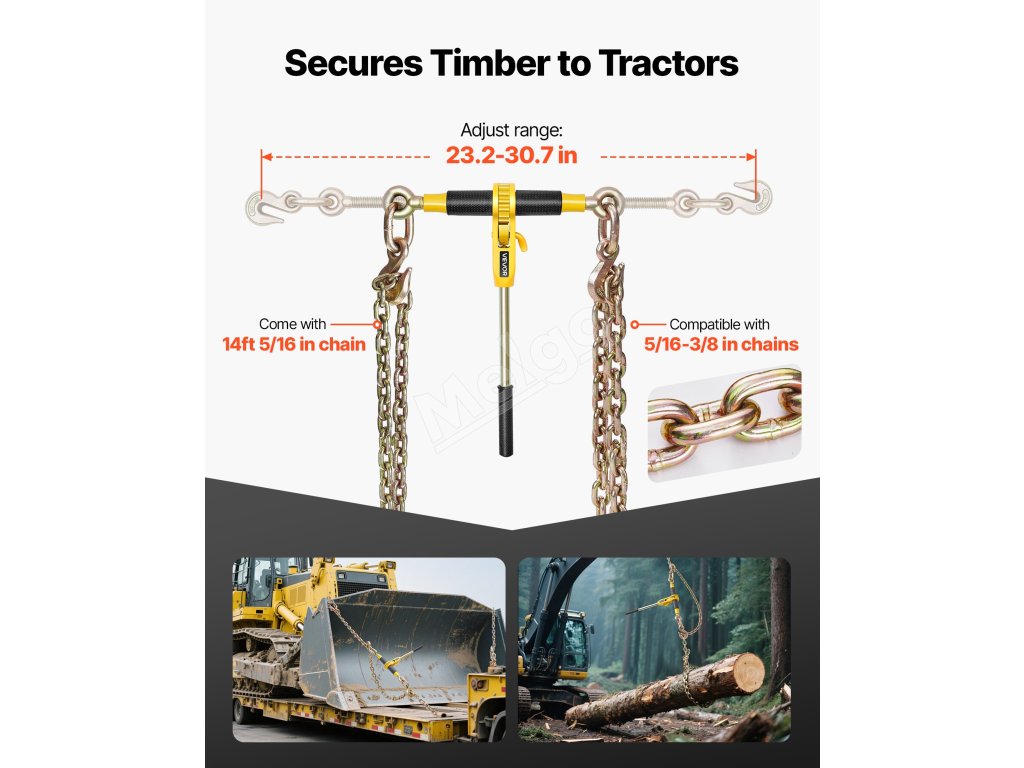 Odpoveď: Nastavuje sa od 23,2 palca (min.) do 30,7 palca (max.). Vhodný pre reťaze s priemerom 5/16 až 3/8 palca - ideálny na ťažbu dreva, viazanie a prepravu.