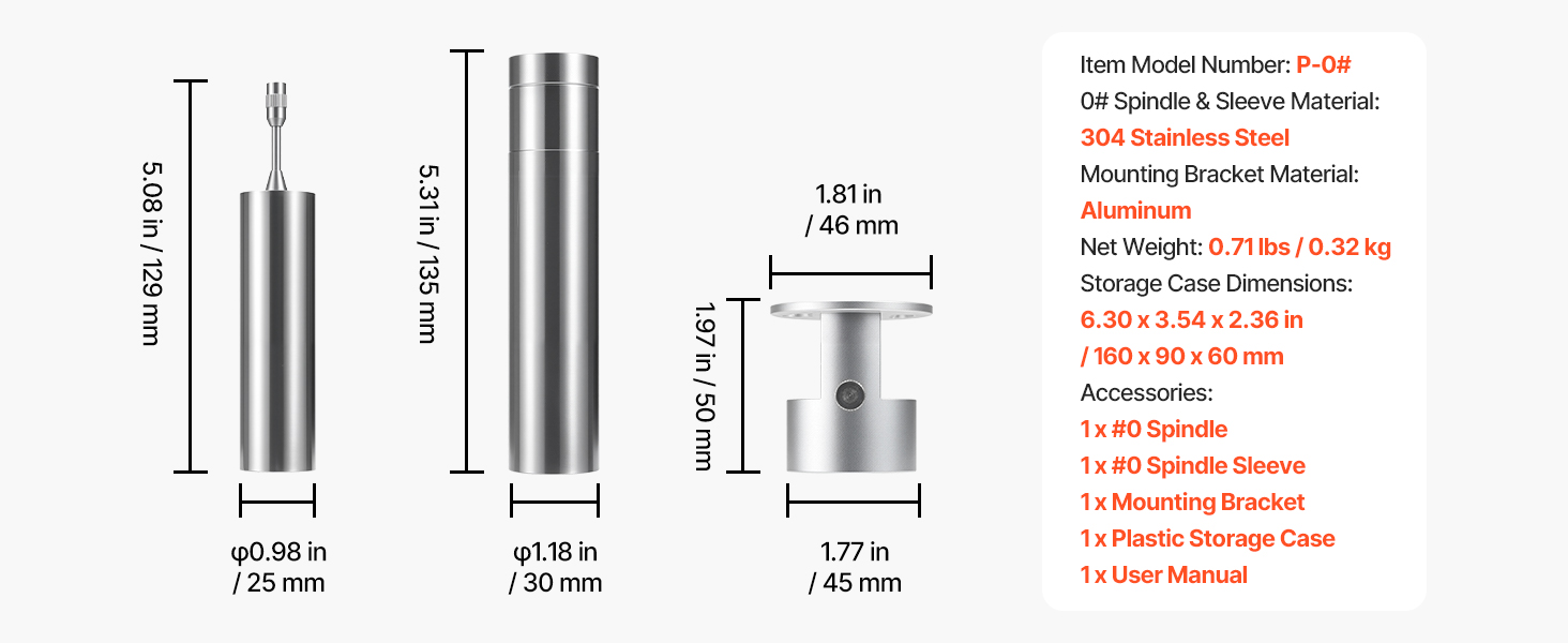 Vreteno viskozimetra 0# a puzdro vretena sú vyrobené z nehrdzavejúcej ocele 304 a sú vhodné na použitie v roztokoch v širokom rozsahu pH.