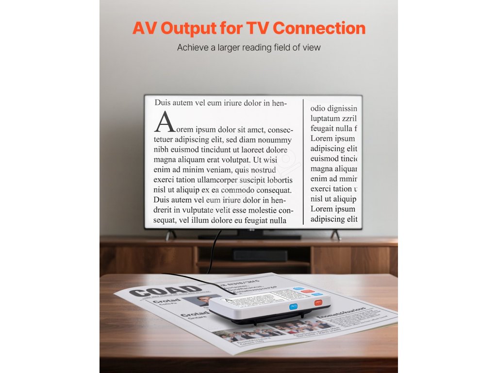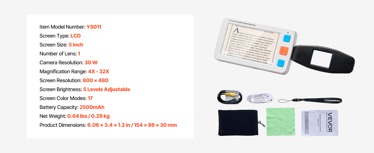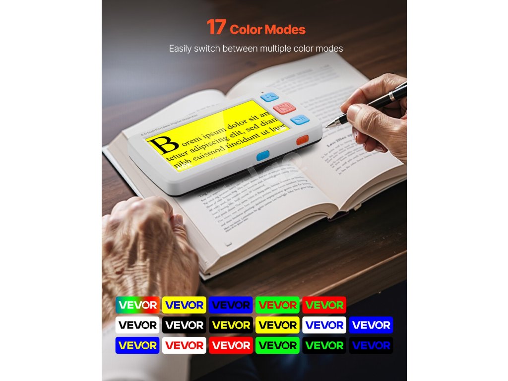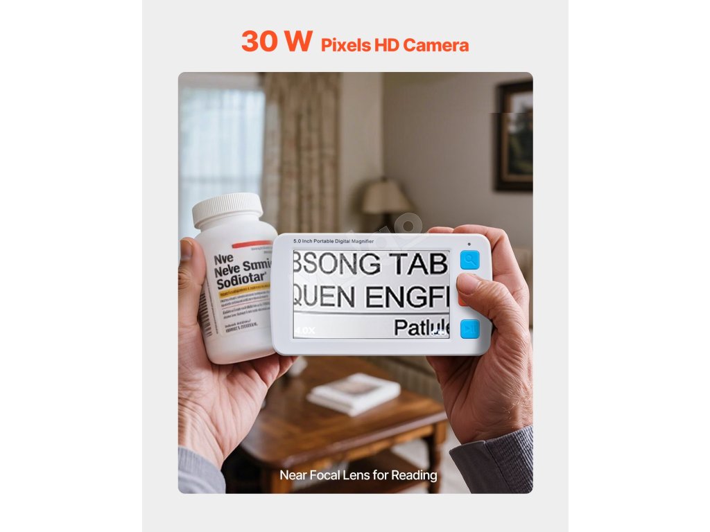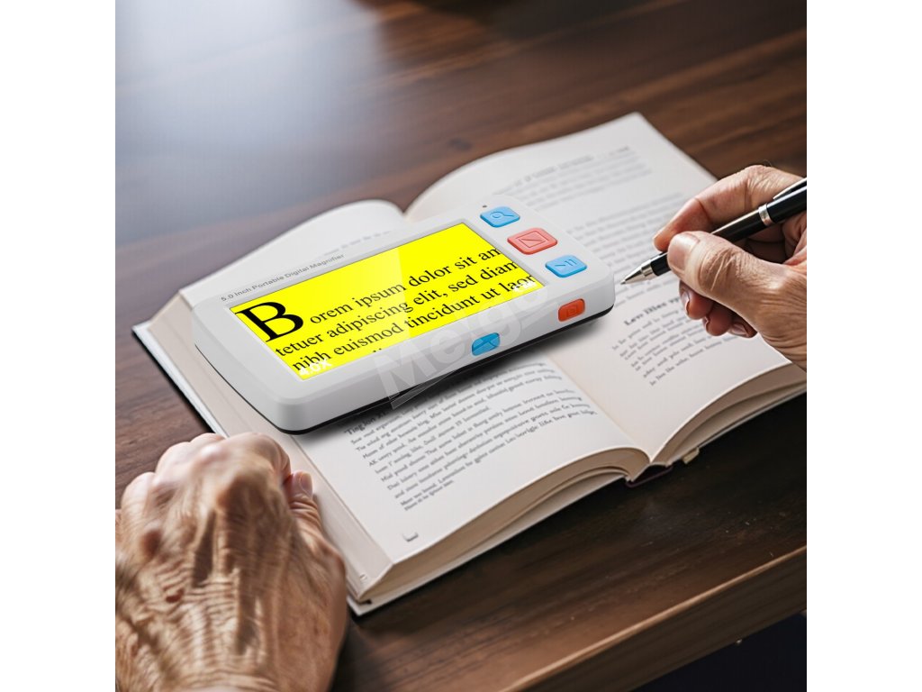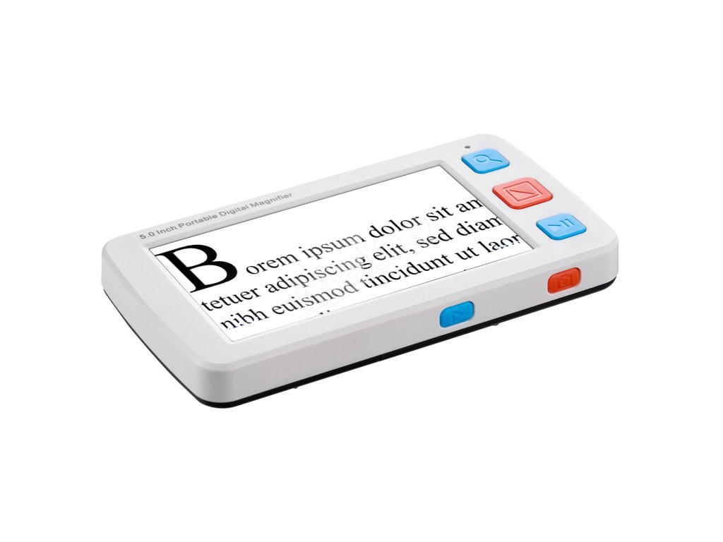 Táto prenosná digitálna lupa s 5,0-palcovým HD LCD displejom, 4- až 32-násobným zväčšením s vysokým rozlíšením, 17 farebnými režimami, 5-stupňovým jasom LCD displeja, AV výstupom a 2500 mAh nabíjateľnou batériou ponúka komplexnú vizuálnu pomoc pre ľudí so slabým zrakom pri čítaní a prezeraní obrázkov.