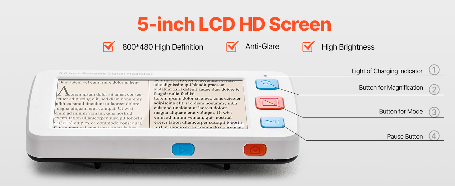 Táto digitálna lupa pre slabozrakých je vybavená 5-palcovým LCD displejom s vysokým rozlíšením 800 x 480. Poskytuje jasný obraz, antireflexný displej a pohodlný zážitok zo sledovania, čo je ideálne pre osoby so slabým zrakom na každodenné čítanie alebo prezeranie obrázkov.