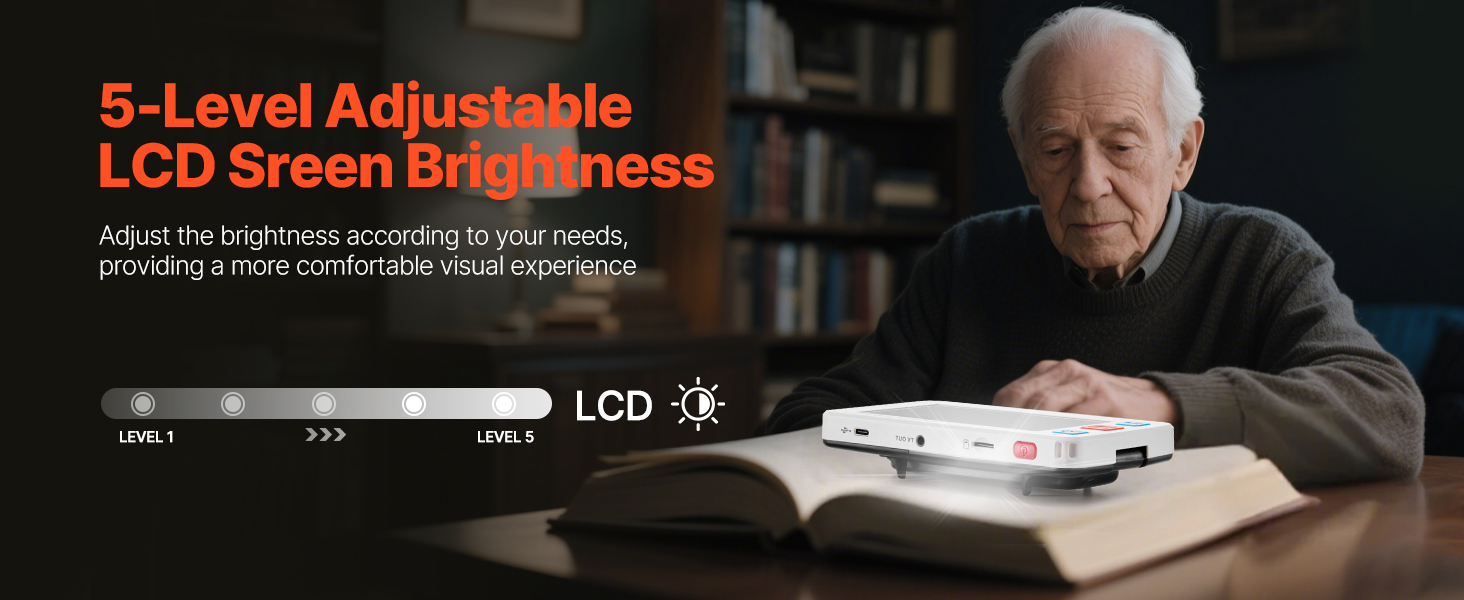 Táto prenosná digitálna video lupa s 5-stupňovým jasom LCD displeja umožňuje nastaviť jas podľa vašich potrieb, čím poskytuje pohodlnejšie sledovanie - znižuje namáhanie očí a pomáha chrániť váš zrak.