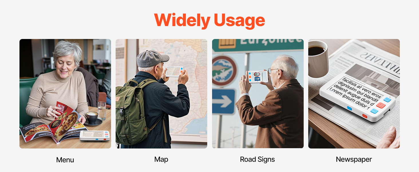 Či už čítate jedálny lístok, kontrolujete mapu, prezeráte noviny alebo identifikujete dopravné značky, táto prenosná digitálna lupa vám pomôže vidieť detaily jasnejšie - uľahčí vám každodenný život a cestovanie.
