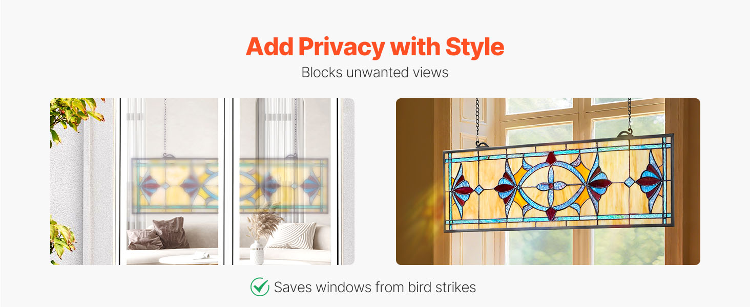 Tento závesný vitrážový panel je navrhnutý tak, aby zakrýval pohľady zvonku, a tak udržuje vašu miestnosť svetlú a zároveň blokuje zvedavé pohľady - ideálny pre okná orientované do ulice alebo k susedom. Pomáha tiež zabrániť nárazom vtákov a pôsobí ako jemná bezpečnostná vrstva.