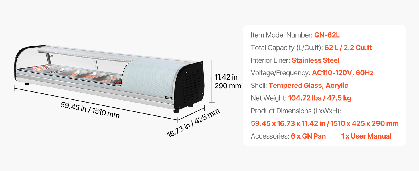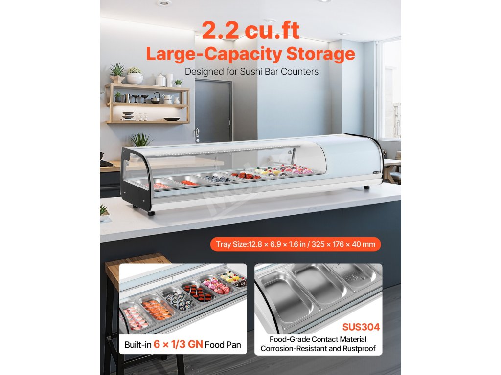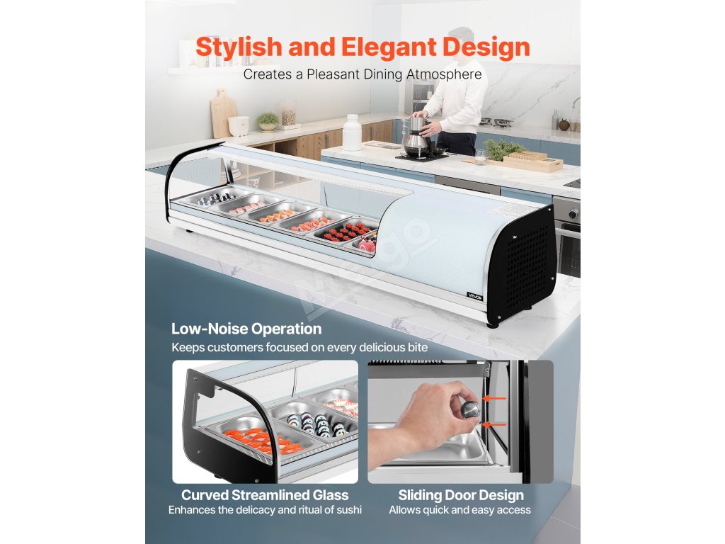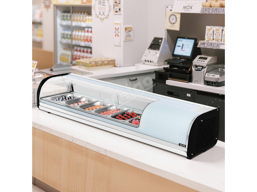 Táto vitrína na sushi ponúka 62L priestor so 6 x 1/3 GN nerezovými panvicami, 35,6-46,4℉ (2-8 ℃) reguláciou teploty, zakriveným tvrdeným sklom a LED osvetlením pre prehľadné zobrazenie, plus posuvné dvere pre ľahký prístup v sushi baroch, obchodoch a supermarketoch.