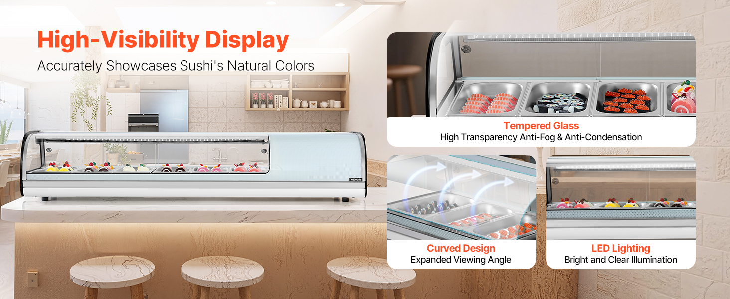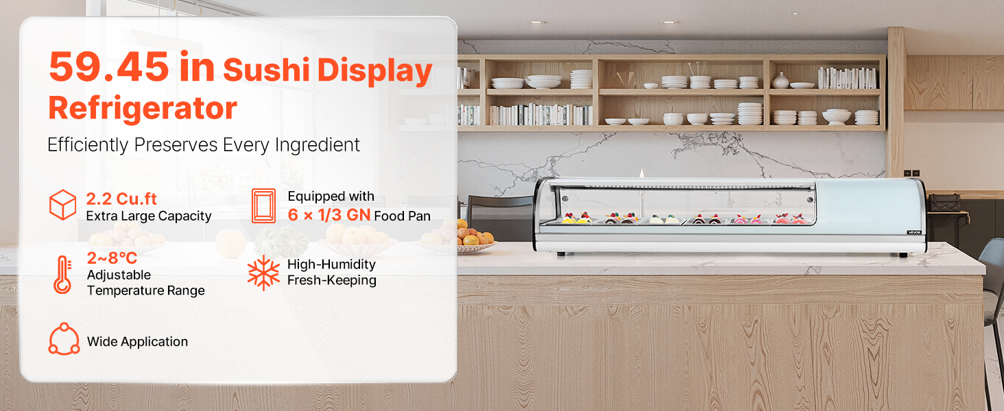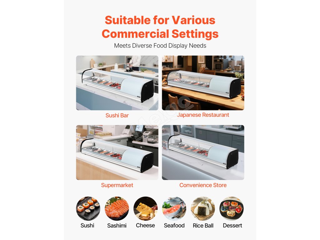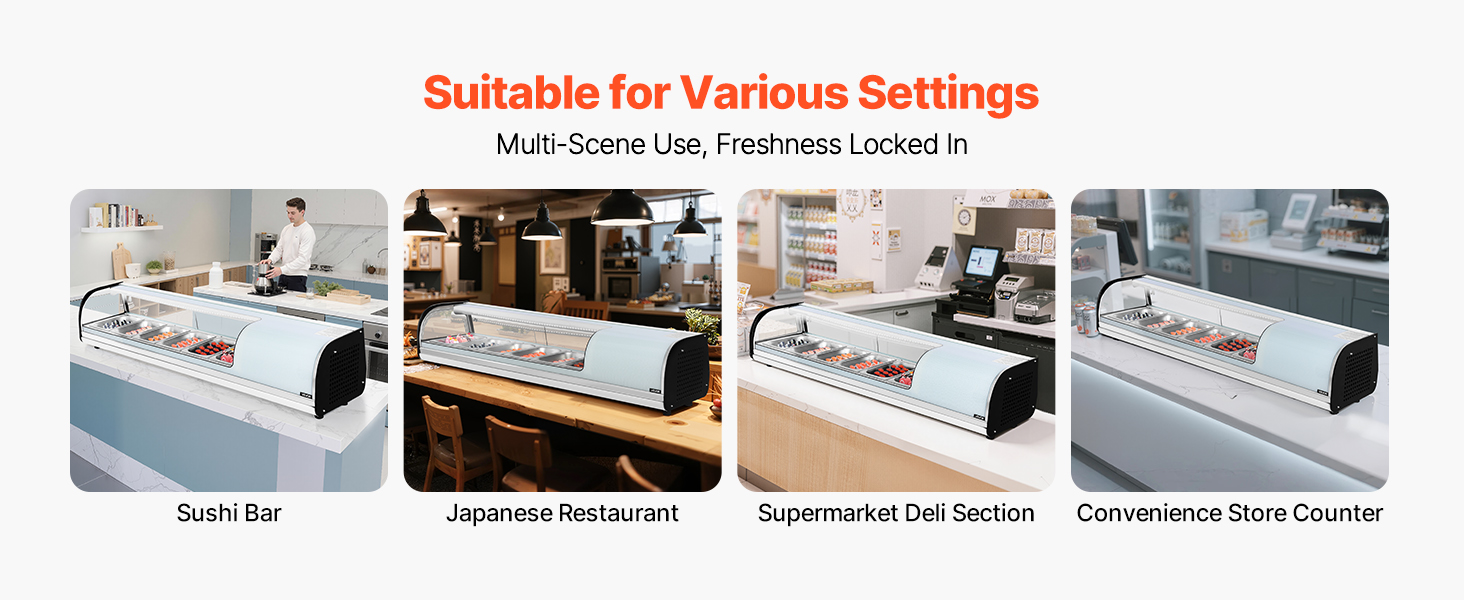 Vitrína na sushi sa bez problémov začlení do pultu sushi baru, japonských reštaurácií, supermarketov a obchodov so zmiešaným tovarom. Krásne prezentuje sushi, sashimi, syry alebo dezerty, pričom zachováva čerstvosť, zvyšuje vizuálnu príťažlivosť a spĺňa rozmanité požiadavky na obchodný priestor.