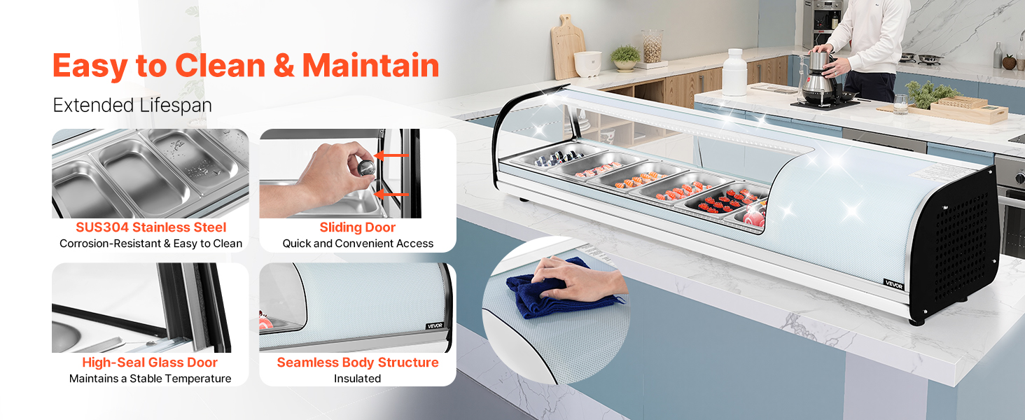 Vďaka miskám z nehrdzavejúcej ocele SUS304 určenej na výrobu potravín, odolnej proti korózii a opotrebovaniu, vitrína na sushi zaručuje dlhodobé používanie bez deformácie. Zadné posuvné dvere a hladký povrch uľahčujú prístup a čistenie a minimalizujú straty studeného vzduchu.